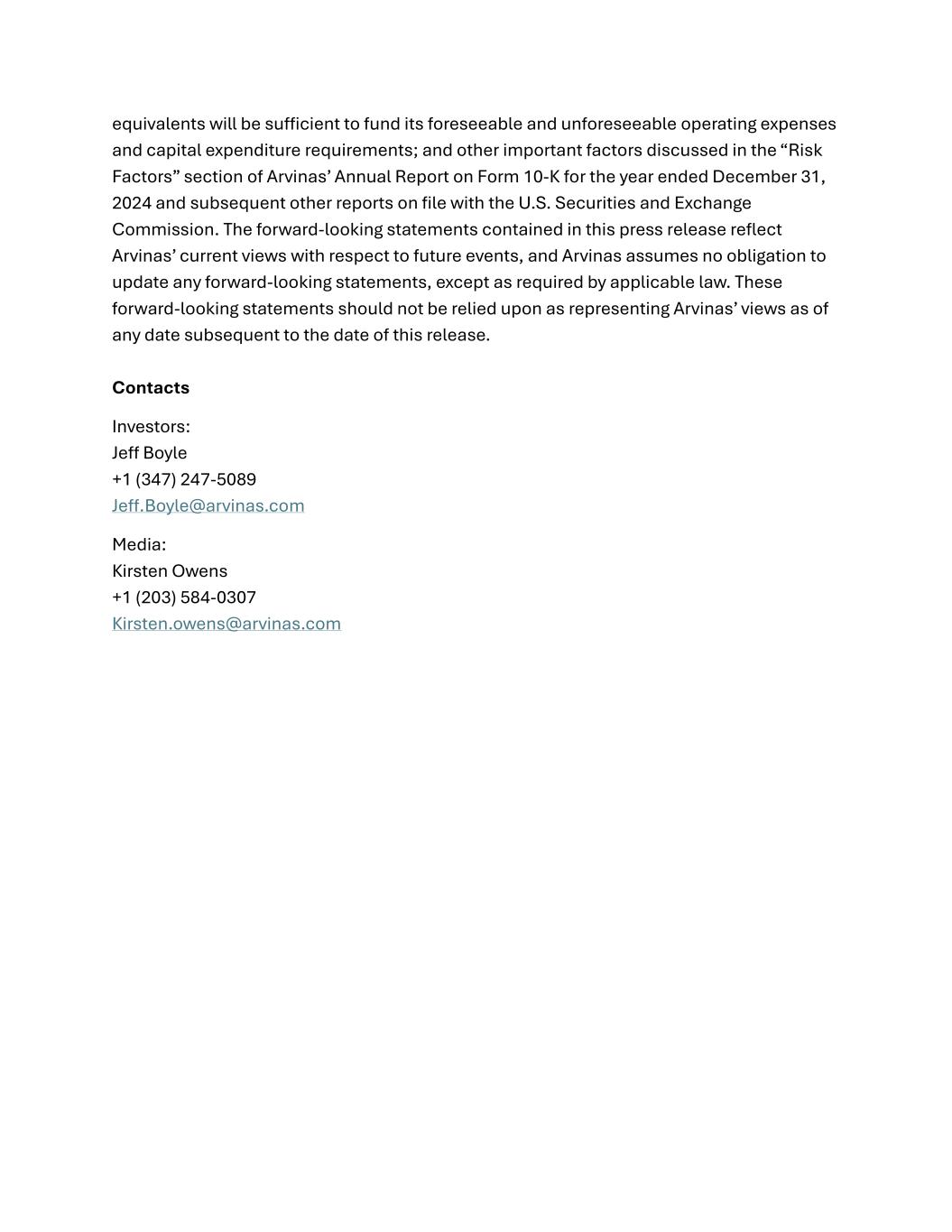equivalents will be sufficient to fund its foreseeable and unforeseeable operating expenses and capital expenditure requirements; and other important factors discussed in the “Risk Factors” section of Arvinas’ Annual Report on Form 10-K for the year ended December 31, 2024 and subsequent other reports on file with the U.S. Securities and Exchange Commission. The forward-looking statements contained in this press release reflect Arvinas’ current views with respect to future events, and Arvinas assumes no obligation to update any forward-looking statements, except as required by applicable law. These forward-looking statements should not be relied upon as representing Arvinas’ views as of any date subsequent to the date of this release. Contacts Investors: Jeff Boyle +1 (347) 247-5089 Jeff.Boyle@arvinas.com Media: Kirsten Owens +1 (203) 584-0307 Kirsten.owens@arvinas.com