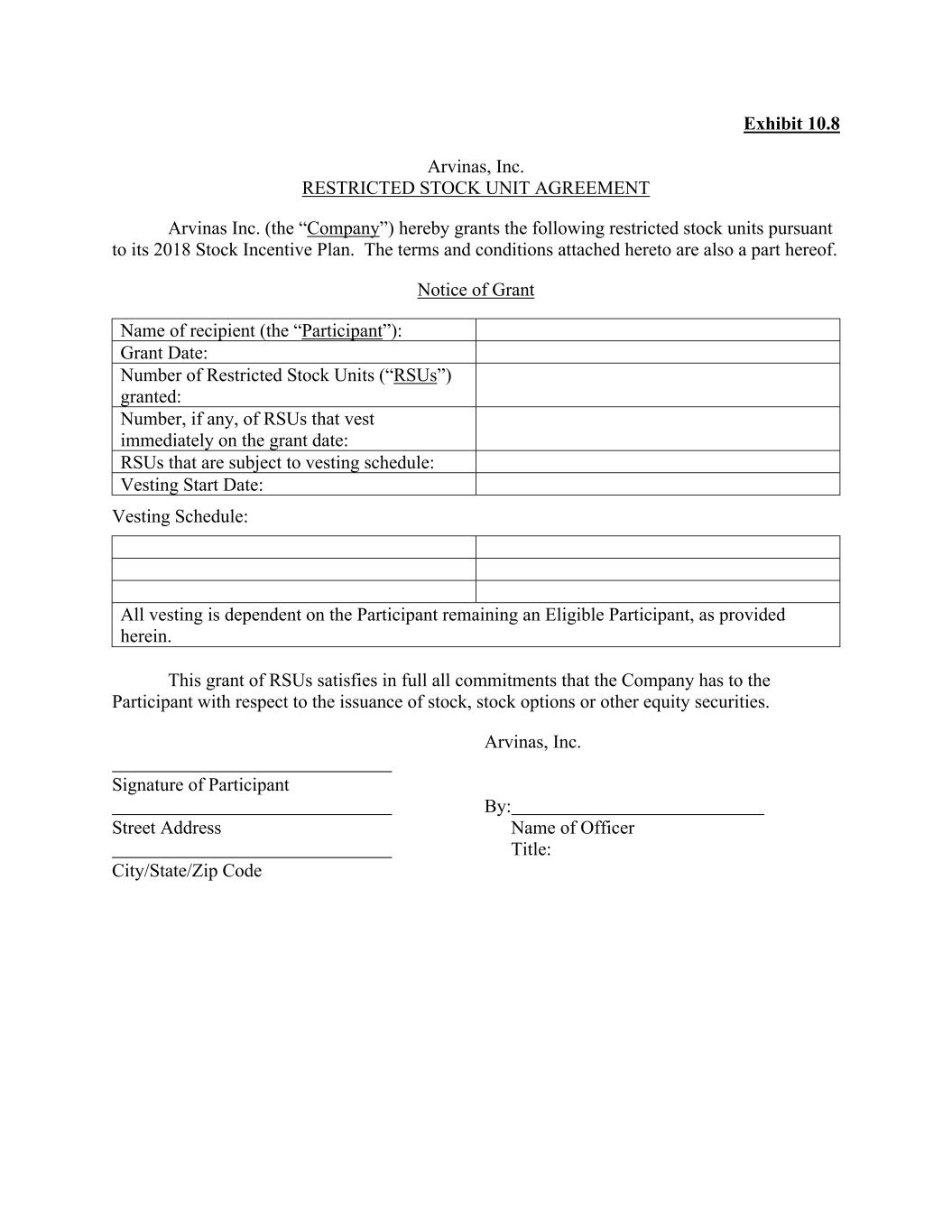 Exhibit 10.8 Arvinas, Inc. RESTRICTED STOCK UNIT AGREEMENT Arvinas Inc. (the “Company”) hereby grants the following restricted stock units pursuant to its 2018 Stock Incentive Plan. The terms and conditions attached hereto are also a part hereof. Notice of Grant Name of recipient (the “Participant”): Grant Date: Number of Restricted Stock Units (“RSUs”) granted: Number, if any, of RSUs that vest immediately on the grant date: RSUs that are subject to vesting schedule: Vesting Start Date: Vesting Schedule: All vesting is dependent on the Participant remaining an Eligible Participant, as provided herein. This grant of RSUs satisfies in full all commitments that the Company has to the Participant with respect to the issuance of stock, stock options or other equity securities. Arvinas, Inc. Signature of Participant Street Address By: Name of Officer Title: City/State/Zip Code