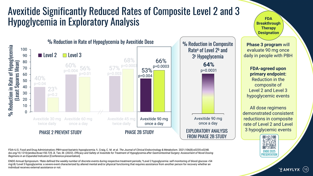 Avexitide Significantly Reduced Rates of Composite Level 2 and 3 FDA Breakthrough Hypoglycemia in Exploratory Analysis Therapy Designation % Reduction in Rate of Hypoglycemia by Avexitide Dose % Reduction in Composite Phase 3 program will 100 a b evaluate 90 mg once Rate of Level 2 and 90 Level 2 Level 3 c daily in people with PBH 3 Hypoglycemia 68% 66% 80 64% p=0.0003 60% p=0.0003 70 57% FDA-agreed upon 56% p=0.0031 p=0.004 53% p=0.01 p=0.003 60 primary endpoint: p=0.004 40% Reduction in the 50 p=0.04 composite of 40 % 23 Level 2 and Level 3 30 p=0.2 hypoglycemic events 20 10 All dose regimens 0 demonstrated consistent Avexitide 90 mg Avexitide 30 mg Avexitide 60 mg Avexitide 45 mg Avexitide 90 mg reductions in composite once a day twice daily once a day twice daily once a day rate of Level 2 and Level 3 hypoglycemic events EXPLORATORY ANALYSIS PHASE 2B STUDY PHASE 2 PREVENT STUDY FROM PHASE 2B STUDY FDA=U.S. Food and Drug Administration; PBH=post-bariatric hypoglycemia; 1. Craig, C. M. et al. The Journal of Clinical Endocrinology & Metabolism. 2021;106(8):e3235-e3248. ENDO 2025 doi.org/10.1210/jendso/bvac150.725. 2. Tan, M. (2022). Efficacy and Safety of Avexitide for Treatment of Hypoglycemia after Gastrointestinal Surgery: Assessment of Novel Dosing PRESENTATION Regimens in an Expanded Indication [Conference presentation]. a b ENDO Annual Symposium. Rate defined the weekly number of discrete events during respective treatment periods; Level 2 hypoglycemia: self-monitoring of blood glucose <54 c mg/dL Level 3 hypoglycemia: a severe event characterized by altered mental and/or physical functioning that requires assistance from another person for recovery whether an individual receives external assistance or not. 10 % Reduction in Rate of Hypoglycemia (Least Squares Mean)
