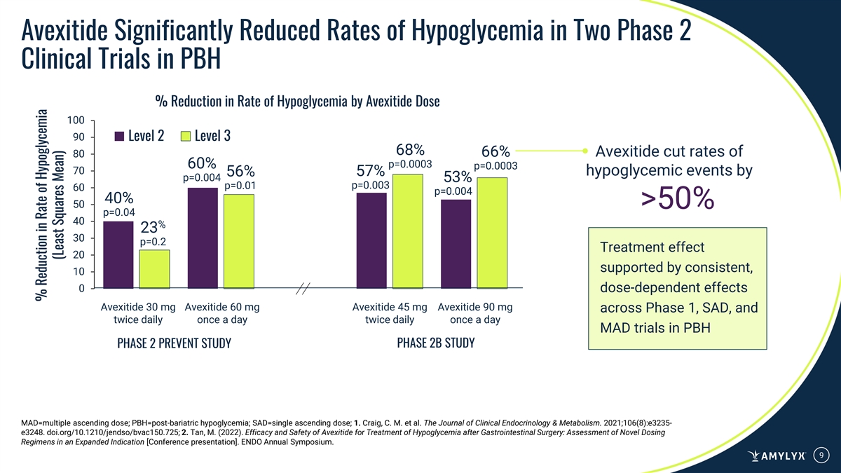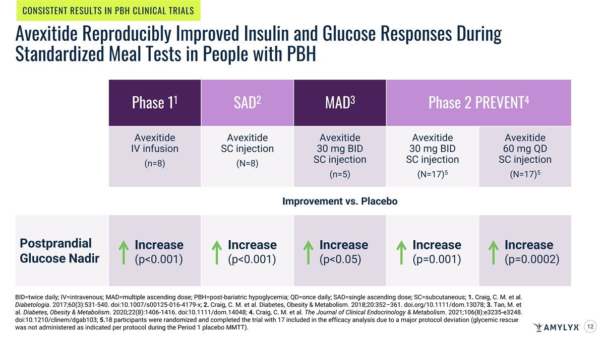 CONSISTENT RESULTS IN PBH CLINICAL TRIALS Avexitide Reproducibly Improved Insulin and Glucose Responses During Standardized Meal Tests in People with PBH 1 2 3 4 Phase 1 SAD MAD Phase 2 PREVENT Avexitide Avexitide Avexitide Avexitide Avexitide IV infusion SC injection 30 mg BID 30 mg BID 60 mg QD SC injection SC injection SC injection (n=8) (N=8) 5 5 (n=5) (N=17) (N=17) Improvement vs. Placebo Postprandial Increase Increase Increase Increase Increase Glucose Nadir (p<0.001) (p<0.001) (p<0.05) (p=0.001) (p=0.0002) BID=twice daily; IV=intravenous; MAD=multiple ascending dose; PBH=post-bariatric hypoglycemia; QD=once daily; SAD=single ascending dose; SC=subcutaneous; 1. Craig, C. M. et al. Diabetologia. 2017;60(3):531-540. doi:10.1007/s00125-016-4179-x; 2. Craig, C. M. et al. Diabetes, Obesity & Metabolism. 2018;20:352–361. doi.org/10.1111/dom.13078; 3. Tan, M. et al. Diabetes, Obesity & Metabolism. 2020;22(8):1406-1416. doi:10.1111/dom.14048; 4. Craig, C. M. et al. The Journal of Clinical Endocrinology & Metabolism. 2021;106(8):e3235-e3248. doi:10.1210/clinem/dgab103; 5.18 participants were randomized and completed the trial with 17 included in the efficacy analysis due to a major protocol deviation (glycemic rescue 12 was not administered as indicated per protocol during the Period 1 placebo MMTT).