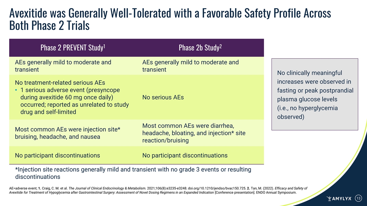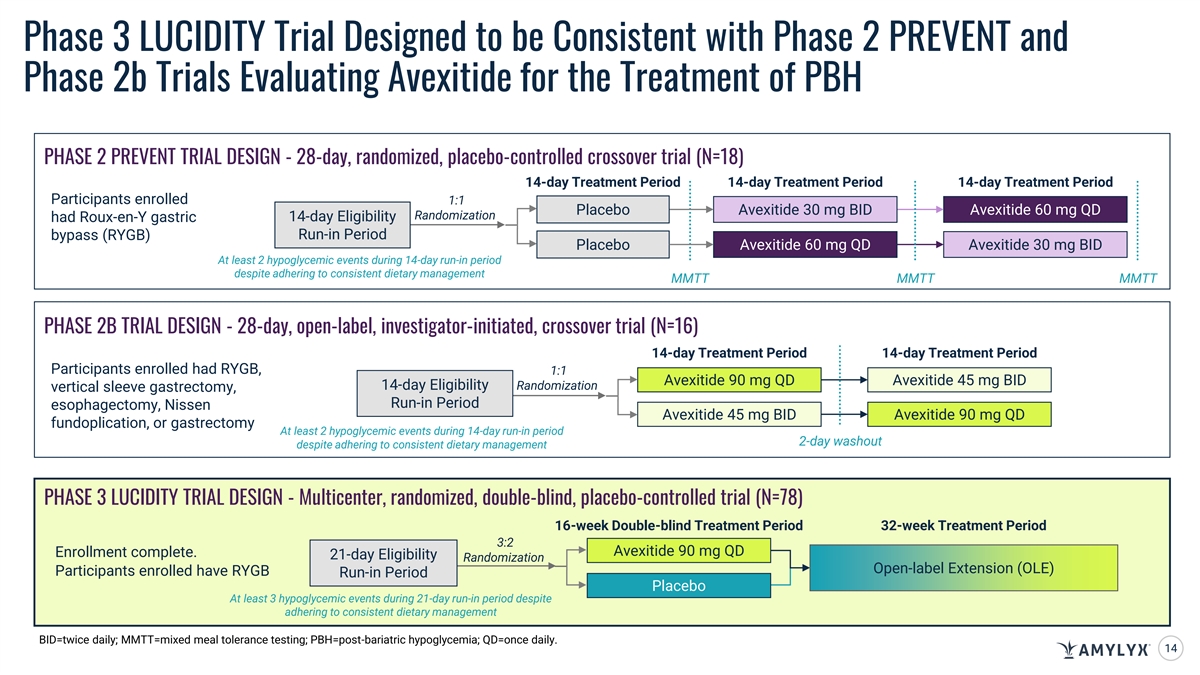 Avexitide was Generally Well-Tolerated with a Favorable Safety Profile Across Both Phase 2 Trials 1 2 Phase 2 PREVENT Study Phase 2b Study AEs generally mild to moderate and AEs generally mild to moderate and transient transient No clinically meaningful increases were observed in No treatment-related serious AEs • 1 serious adverse event (presyncope fasting or peak postprandial during avexitide 60 mg once daily) No serious AEs plasma glucose levels occurred; reported as unrelated to study (i.e., no hyperglycemia drug and self-limited observed) Most common AEs were diarrhea, Most common AEs were injection site* headache, bloating, and injection* site bruising, headache, and nausea reaction/bruising No participant discontinuations No participant discontinuations *Injection site reactions generally mild and transient with no grade 3 events or resulting discontinuations AE=adverse event; 1. Craig, C. M. et al. The Journal of Clinical Endocrinology & Metabolism. 2021;106(8):e3235-e3248. doi.org/10.1210/jendso/bvac150.725. 2. Tan, M. (2022). Efficacy and Safety of Avexitide for Treatment of Hypoglycemia after Gastrointestinal Surgery: Assessment of Novel Dosing Regimens in an Expanded Indication [Conference presentation]. ENDO Annual Symposium. 13