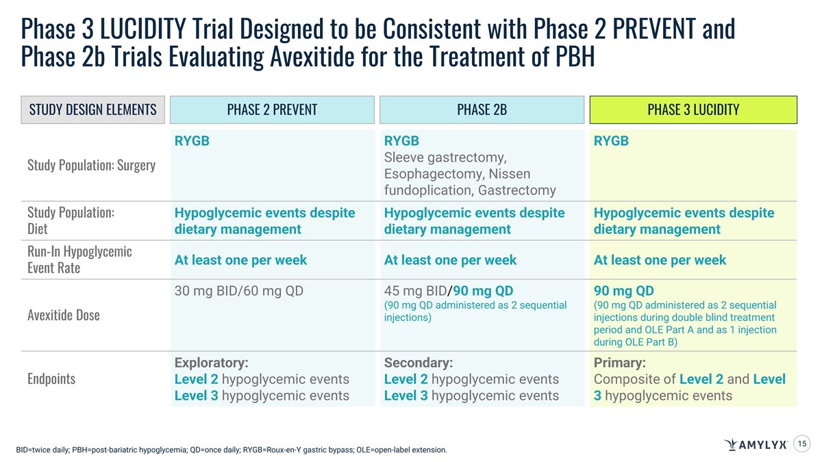 Phase 3 LUCIDITY Trial Designed to be Consistent with Phase 2 PREVENT and Phase 2b Trials Evaluating Avexitide for the Treatment of PBH STUDY DESIGN ELEMENTS PHASE 2 PREVENT PHASE 2B PHASE 3 LUCIDITY RYGB RYGB RYGB Sleeve gastrectomy, Study Population: Surgery Esophagectomy, Nissen fundoplication, Gastrectomy Hypoglycemic events despite Hypoglycemic events despite Hypoglycemic events despite Study Population: dietary management dietary management dietary management Diet Run-In Hypoglycemic At least one per week At least one per week At least one per week Event Rate 30 mg BID/60 mg QD 45 mg BID/90 mg QD 90 mg QD (90 mg QD administered as 2 sequential (90 mg QD administered as 2 sequential Avexitide Dose injections) injections during double blind treatment period and OLE Part A and as 1 injection during OLE Part B) Exploratory: Secondary: Primary: Endpoints Level 2 hypoglycemic events Level 2 hypoglycemic events Composite of Level 2 and Level Level 3 hypoglycemic events Level 3 hypoglycemic events 3 hypoglycemic events 15 BID=twice daily; PBH=post-bariatric hypoglycemia; QD=once daily; RYGB=Roux-en-Y gastric bypass; OLE=open-label extension.