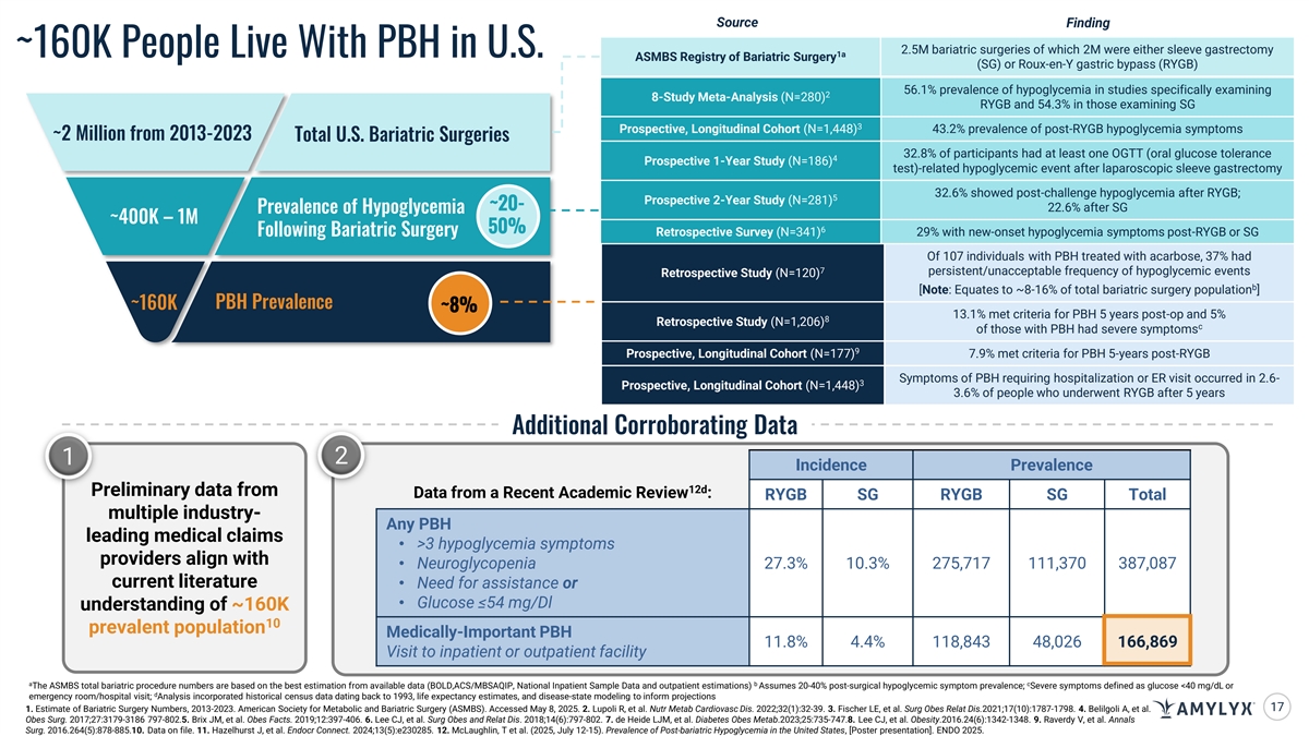 Post-Bariatric Hypoglycemia (PBH) is Believed to be Caused by Excessive GLP-1 Response that Leads to Hyperinsulinemic Hypoglycemia Post-Meal Hypoglycemia from PBH is Often ~160,000 >200K Dangerous and Life-Altering people new procedures • General fatigue, confusion, difficulty 1 occur annually Currently living with speaking, blurred vision 1-3 PBH in the U.S. PBH develops on average 1-3 years • Risk of falls, seizures, vehicle accidents No approved treatment options post surgery • Job and income loss Rate of Gastric Bypass by Type 350,000 300,000 LIVING WITH PBH 250,000 BETWEEN 2013-2023 200,000 “It affected my ability to work and Sleeve.....~1.4 million 150,000 take care of my family.” RYGB......~0.6 Million 100,000 Total………~2.5 Million “I pass out multiple times a week. 50,000 0 My lows are averaging 4-5 times 2013 '14 '15 '16 '17 '18 '19 '20 '21 22 2023 a day.” Sleeve RYGB Total “I lost my driver’s license since I am unaware of my lows.” PBH=post-bariatric hypoglycemia; RYGB=Roux-en-Y gastric bypass; 1. Estimate of Bariatric Surgery Numbers, 2013-2023. American Society for Metabolic and Bariatric Surgery (ASMBS). Accessed May 8, 2025. 2. Raverdy V. et al. Annals of Surgery. 2016;264(5):878-885. doi:10.1097/SLA.0000000000001768. 3. de Heide, L. J. M. et al. Diabetes, Obesity, & Metabolism. 2023;25:735-747. doi.org/10.1111/dom.14920. 16