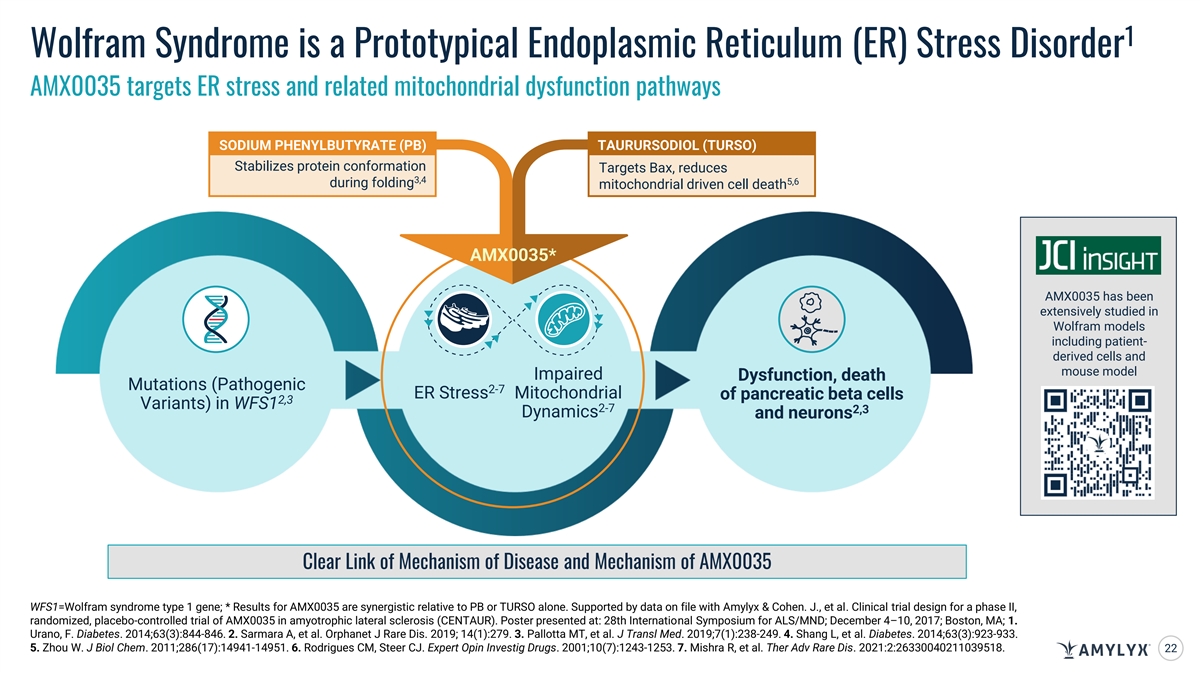 1 Wolfram Syndrome is a Prototypical Endoplasmic Reticulum (ER) Stress Disorder AMX0035 targets ER stress and related mitochondrial dysfunction pathways SODIUM PHENYLBUTYRATE (PB) TAURURSODIOL (TURSO) Stabilizes protein conformation Targets Bax, reduces 3,4 5,6 during folding mitochondrial driven cell death AMX0035* AMX0035 has been extensively studied in Wolfram models including patient- derived cells and mouse model Impaired Dysfunction, death Mutations (Pathogenic 2-7 ER Stress Mitochondrial of pancreatic beta cells 2,3 Variants) in WFS1 2-7 2,3 Dynamics and neurons Clear Link of Mechanism of Disease and Mechanism of AMX0035 WFS1=Wolfram syndrome type 1 gene; * Results for AMX0035 are synergistic relative to PB or TURSO alone. Supported by data on file with Amylyx & Cohen. J., et al. Clinical trial design for a phase II, randomized, placebo-controlled trial of AMX0035 in amyotrophic lateral sclerosis (CENTAUR). Poster presented at: 28th International Symposium for ALS/MND; December 4–10, 2017; Boston, MA; 1. Urano, F. Diabetes. 2014;63(3):844-846. 2. Sarmara A, et al. Orphanet J Rare Dis. 2019; 14(1):279. 3. Pallotta MT, et al. J Transl Med. 2019;7(1):238-249. 4. Shang L, et al. Diabetes. 2014;63(3):923-933. 5. Zhou W. J Biol Chem. 2011;286(17):14941-14951. 6. Rodrigues CM, Steer CJ. Expert Opin Investig Drugs. 2001;10(7):1243-1253. 7. Mishra R, et al. Ther Adv Rare Dis. 2021:2:26330040211039518. 22