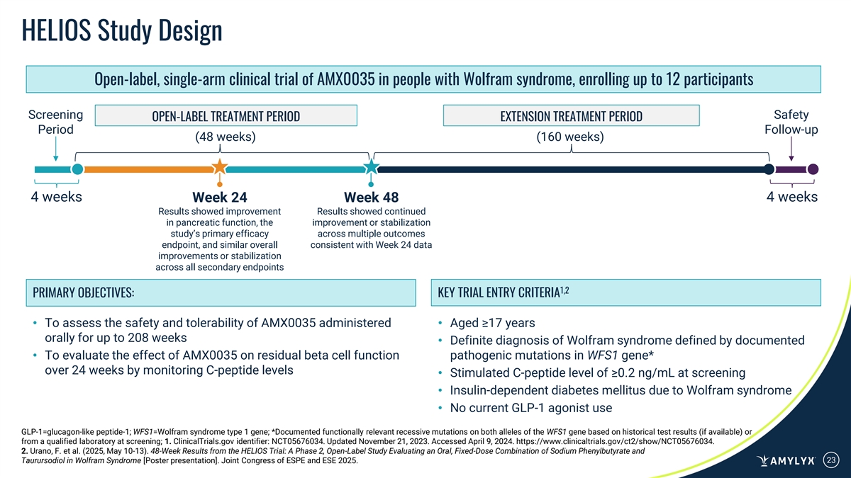 HELIOS Study Design Open-label, single-arm clinical trial of AMX0035 in people with Wolfram syndrome, enrolling up to 12 participants Screening Safety OPEN-LABEL TREATMENT PERIOD EXTENSION TREATMENT PERIOD Period Follow-up (48 weeks) (160 weeks) 4 weeks 4 weeks Week 24 Week 48 Results showed improvement Results showed continued in pancreatic function, the improvement or stabilization study’s primary efficacy across multiple outcomes endpoint, and similar overall consistent with Week 24 data improvements or stabilization across all secondary endpoints 1,2 PRIMARY OBJECTIVES: KEY TRIAL ENTRY CRITERIA • To assess the safety and tolerability of AMX0035 administered • Aged ≥17 years orally for up to 208 weeks • Definite diagnosis of Wolfram syndrome defined by documented • To evaluate the effect of AMX0035 on residual beta cell function pathogenic mutations in WFS1 gene* over 24 weeks by monitoring C-peptide levels • Stimulated C-peptide level of ≥0.2 ng/mL at screening • Insulin-dependent diabetes mellitus due to Wolfram syndrome • No current GLP-1 agonist use GLP-1=glucagon-like peptide-1; WFS1=Wolfram syndrome type 1 gene; *Documented functionally relevant recessive mutations on both alleles of the WFS1 gene based on historical test results (if available) or from a qualified laboratory at screening; 1. ClinicalTrials.gov identifier: NCT05676034. Updated November 21, 2023. Accessed April 9, 2024. https://www.clinicaltrials.gov/ct2/show/NCT05676034. 2. Urano, F. et al. (2025, May 10-13). 48-Week Results from the HELIOS Trial: A Phase 2, Open-Label Study Evaluating an Oral, Fixed-Dose Combination of Sodium Phenylbutyrate and Taurursodiol in Wolfram Syndrome [Poster presentation]. Joint Congress of ESPE and ESE 2025. 23