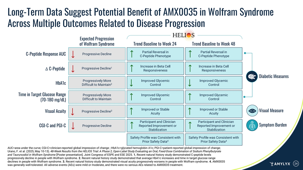 Long-Term Data Suggest Potential Benefit of AMX0035 in Wolfram Syndrome Across Multiple Outcomes Related to Disease Progression Expected Progression of Wolfram Syndrome Trend Baseline to Week 24 Trend Baseline to Week 48 Partial Reversal in Partial Reversal in Progressive Decline C-Peptide Response AUC C-Peptide Phenotype C-Peptide Phenotype Increase in Beta Cell Increase in Beta Cell 1 Progressive Decline ∆ C-Peptide Responsiveness Responsiveness Diabetic Measures Progressively More Improved Glycemic Improved Glycemic HbA1c 2 Difficult to Maintain Control Control Time in Target Glucose Range Progressively More Improved Glycemic Improved Glycemic Difficult to Maintain Control Control (70-180 mg/dL) Improved or Stable Improved or Stable 3 Visual Measure Progressive Decline Visual Acuity Acuity Acuity Participant and Clinician Participant and Clinician Symptom Burden Progressive Decline Reported Improvement or Reported Improvement or CGI-C and PGI-C Stabilization Stabilization Safety Profile was Consistent with Safety Profile was Consistent with 4 4 Prior Safety Data Prior Safety Data AUC=area under the curve; CGI-C=clinician-reported global impression of change ; HbA1c=glycated hemoglobin A1c; PGI-C=patient-reported global impression of change; Urano, F. et al. (2025, May 10-13). 48-Week Results from the HELIOS Trial: A Phase 2, Open-Label Study Evaluating an Oral, Fixed-Dose Combination of Sodium Phenylbutyrate and Taurursodiol in Wolfram Syndrome [Poster presentation]. Joint Congress of ESPE and ESE 2025. 1. Recent natural history study demonstrated C-peptide levels progressively decline in people with Wolfram syndrome. 2. Recent natural history study demonstrated that average HbA1c increases and time in target glucose range declines in people with Wolfram syndrome. 3. Recent natural history study demonstrated visual acuity progressively worsens in people with Wolfram syndrome. 4. AMX0035 24 was generally well-tolerated. All adverse events (AEs) were mild or moderate, and there were no serious AEs related to AMX0035 treatment.