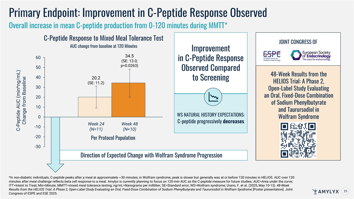 Primary Endpoint: Improvement in C-Peptide Response Observed Overall increase in mean C-peptide production from 0-120 minutes during MMTT* C-Peptide Response to Mixed Meal Tolerance Test JOINT CONGRESS OF AUC change from baseline at 120 Minutes Improvement 34.5 & 60 in C-Peptide Response (SE: 13.0; p=0.0263) 50 Observed Compared 48-Week Results from the 40 20.2 to Screening HELIOS Trial: A Phase 2, (SE: 11.2) 30 Open-Label Study Evaluating an Oral, Fixed-Dose Combination 20 of Sodium Phenylbutyrate 10 and Taurursodiol in WS NATURAL HISTORY EXPECTATIONS: 0 Wolfram Syndrome C-peptide progressively decreases Week 24 Week 48 -10 (N=11) (N=10) -20 Per Protocol Population -30 Direction of Expected Change with Wolfram Syndrome Progression *In non-diabetic individuals, C-peptide peaks after a meal at approximately ~30 minutes; in Wolfram syndrome, peak is slower but generally was at or before 120 minutes in HELIOS. AUC over 120 minutes after meal challenge reflects beta cell response to a meal. Amylyx is currently planning to focus on 120-min AUC as the C-peptide measure for future studies. AUC=Area under the curve; ITT=Intent to Treat; Min=Minute; MMTT=mixed meal tolerance testing; ng/mL=Nanograms per milliliter; SE=Standard error; WS=Wolfram syndrome; Urano, F. et al. (2025, May 10-13). 48-Week Results from the HELIOS Trial: A Phase 2, Open-Label Study Evaluating an Oral, Fixed-Dose Combination of Sodium Phenylbutyrate and Taurursodiol in Wolfram Syndrome [Poster presentation]. Joint 25 25 Congress of ESPE and ESE 2025. C-Peptide AUC (min*ng/mL) Change from Baseline