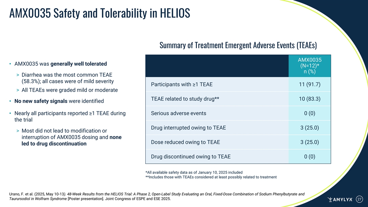 AMX0035 Reduced Overall Symptom Burden at Week 24 and Week 48 Qualitative on-study interview results support potential positive impact of AMX0035 on symptom burden Positive Changes in Wolfram Syndrome-Related Symptoms by Participant Report in On-Study Interviews Vision Problems (n=11) Bladder Issues (n=11) Insulin-Requiring Diabetes (n=10) Fatigue (n=6) Problems Swallowing (n=5) Headaches/Migraine (n=4) 0% 10% 20% 30% 40% 50% 60% 70% 80% Important/Meaningful Positive Change Positive Change n = the number of participants who reported experiencing the symptom pretrial In on-study interviews after at least 24 weeks of treatment, 9 of 11 participants reported improvements in ≥1 Wolfram syndrome-related symptom with all noting the change being meaningful in at least one symptom Data on File. Urano, F. et al. (2025, May 10-13). 48-Week Results from the HELIOS Trial: A Phase 2, Open-Label Study Evaluating an Oral, Fixed-Dose Combination of Sodium Phenylbutyrate and Taurursodiol in Wolfram Syndrome [Poster presentation]. Joint Congress of ESPE and ESE 2025. 26