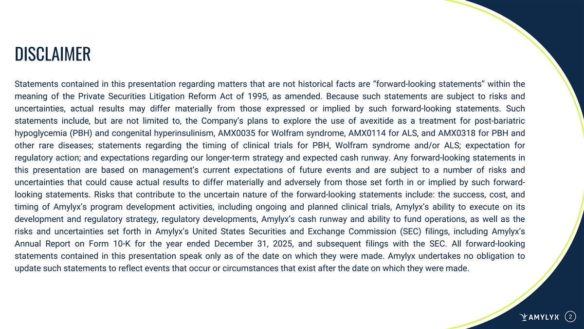 DISCLAIMER Statements contained in this presentation regarding matters that are not historical facts are “forward-looking statements” within the meaning of the Private Securities Litigation Reform Act of 1995, as amended. Because such statements are subject to risks and uncertainties, actual results may differ materially from those expressed or implied by such forward-looking statements. Such statements include, but are not limited to, the Company’s plans to explore the use of avexitide as a treatment for post-bariatric hypoglycemia (PBH) and congenital hyperinsulinism, AMX0035 for Wolfram syndrome, AMX0114 for ALS, and AMX0318 for PBH and other rare diseases; statements regarding the timing of clinical trials for PBH, Wolfram syndrome and/or ALS; expectation for regulatory action; and expectations regarding our longer-term strategy and expected cash runway. Any forward-looking statements in this presentation are based on management’s current expectations of future events and are subject to a number of risks and uncertainties that could cause actual results to differ materially and adversely from those set forth in or implied by such forward- looking statements. Risks that contribute to the uncertain nature of the forward-looking statements include: the success, cost, and timing of Amylyx’s program development activities, including ongoing and planned clinical trials, Amylyx’s ability to execute on its development and regulatory strategy, regulatory developments, Amylyx’s cash runway and ability to fund operations, as well as the risks and uncertainties set forth in Amylyx’s United States Securities and Exchange Commission (SEC) filings, including Amylyx’s Annual Report on Form 10-K for the year ended December 31, 2025, and subsequent filings with the SEC. All forward-looking statements contained in this presentation speak only as of the date on which they were made. Amylyx undertakes no obligation to update such statements to reflect events that occur or circumstances that exist after the date on which they were made. 2