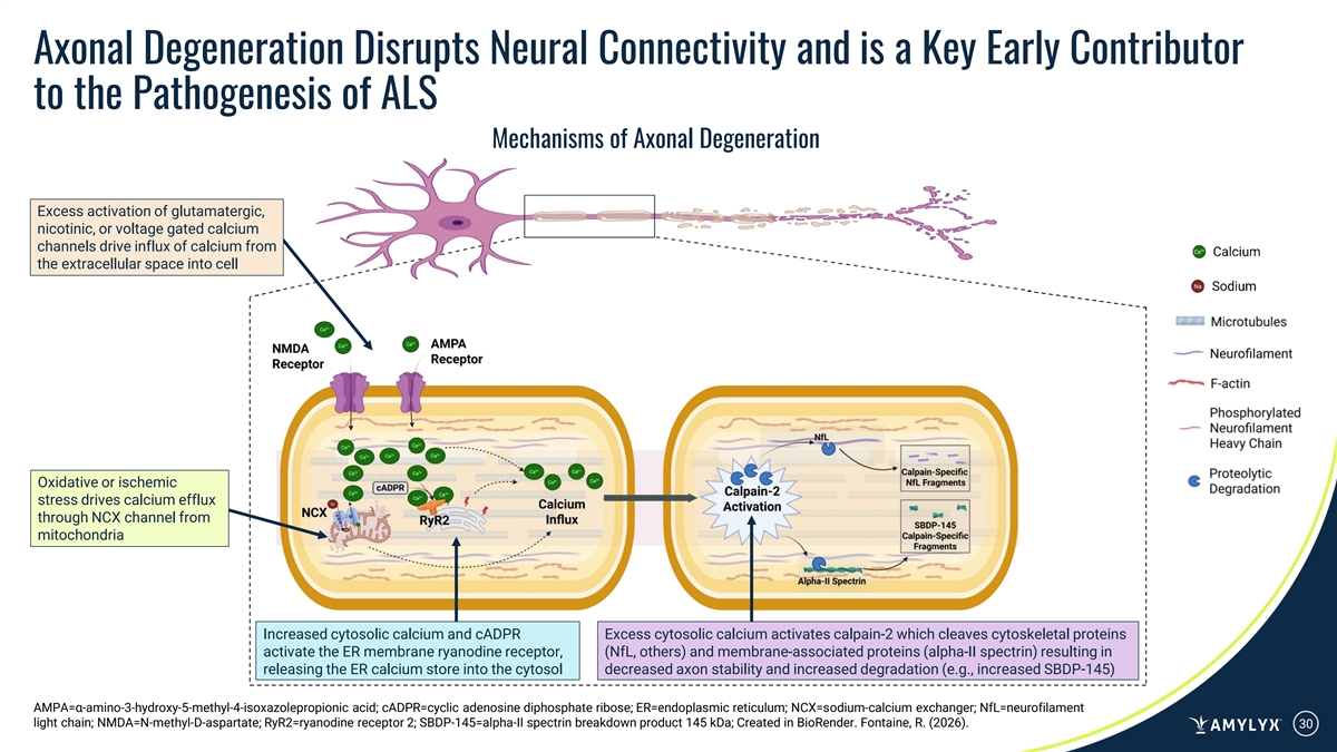 Axonal Degeneration Disrupts Neural Connectivity and is a Key Early Contributor to the Pathogenesis of ALS Mechanisms of Axonal Degeneration Excess activation of glutamatergic, nicotinic, or voltage gated calcium channels drive influx of calcium from the extracellular space into cell Oxidative or ischemic stress drives calcium efflux through NCX channel from mitochondria Increased cytosolic calcium and cADPR Excess cytosolic calcium activates calpain-2 which cleaves cytoskeletal proteins activate the ER membrane ryanodine receptor, (NfL, others) and membrane-associated proteins (alpha-II spectrin) resulting in releasing the ER calcium store into the cytosol decreased axon stability and increased degradation (e.g., increased SBDP-145) AMPA=α-amino-3-hydroxy-5-methyl-4-isoxazolepropionic acid; cADPR=cyclic adenosine diphosphate ribose; ER=endoplasmic reticulum; NCX=sodium-calcium exchanger; NfL=neurofilament light chain; NMDA=N-methyl-D-aspartate; RyR2=ryanodine receptor 2; SBDP-145=alpha-II spectrin breakdown product 145 kDa; Created in BioRender. Fontaine, R. (2026). 30