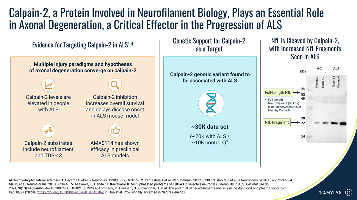 Calpain-2, a Protein Involved in Neurofilament Biology, Plays an Essential Role in Axonal Degeneration, a Critical Effector in the Progression of ALS Genetic Support for Calpain-2 NfL is Cleaved by Calpain-2, 1-4 Evidence for Targeting Calpain-2 in ALS as a Target with Increased NfL Fragments Seen in ALS Multiple injury paradigms and hypotheses of axonal degeneration converge on calpain-2 Calpain-2 genetic variant found to be associated with ALS Full-Length NfL Calpain-2 levels are Calpain-2 inhibition • Full Length Neurofilament (68 kDa) elevated in people increases overall survival is not observed in ALS or 6 with ALS and delays disease onset Healthy Control in ALS mouse model NfL Fragment ~30K data set (~20K with ALS / 7 ~10K controls) Calpain-2 substrates AMX0114 has shown include neurofilament efficacy in preclinical and TDP-43 ALS models ALS=amyotrophic lateral sclerosis; 1. Ueyama H et al. J Neurol Sci. 1998;155(2):163-169. 2. Yamashita T et al. Nat Commun. 2012;3:1307. 3. Rao MV, et al. J Neurochem. 2016;137(2):253-65. 4. Ma M, et al. Neurobiol Dis. 2013;56:34-46. 5. Asakawa, K., Handa, H., Kawakami, K. Multi-phaseted problems of TDP-43 in selective neuronal vulnerability in ALS. Cell Mol Life Sci. 2021;78(10):4453-4465. doi:10.1007/s00018-021-03792-z 6. Lombardi, V., Carassiti, D., Giovannoni, G. et al. The potential of neurofilaments analysis using dry-blood and plasma spots. Sci Rep 10, 97 (2020). https://doi.org/10.1038/s41598-019-54310-y; 7. Hop et al. Provisionally accepted in Nature Genetics. 31