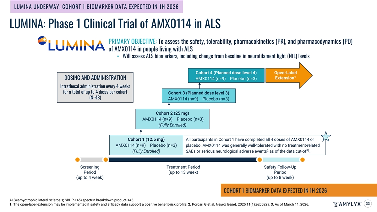 LUMINA UNDERWAY; COHORT 1 BIOMARKER DATA EXPECTED IN 1H 2026 LUMINA: Phase 1 Clinical Trial of AMX0114 in ALS PRIMARY OBJECTIVE: To assess the safety, tolerability, pharmacokinetics (PK), and pharmacodynamics (PD) of AMX0114 in people living with ALS • Will assess ALS biomarkers, including change from baseline in neurofilament light (NfL) levels Cohort 4 (Planned dose level 4) Open-Label 1 Extension DOSING AND ADMINISTRATION AMX0114 (n=9) Placebo (n=3) Intrathecal administration every 4 weeks for a total of up to 4 doses per cohort Cohort 3 (Planned dose level 3) (N=48) AMX0114 (n=9) Placebo (n=3) Cohort 2 (25 mg) AMX0114 (n=9) Placebo (n=3) (Fully Enrolled) Cohort 1 (12.5 mg) All participants in Cohort 1 have completed all 4 doses of AMX0114 or AMX0114 (n=9) Placebo (n=3) placebo. AMX0114 was generally well-tolerated with no treatment-related 2 3 (Fully Enrolled) SAEs or serious neurological adverse events as of the data cut-off . Screening Treatment Period Safety Follow-Up Period (up to 13 week) Period (up to 4 week) (up to 8 week) COHORT 1 BIOMARKER DATA EXPECTED IN 1H 2026 ALS=amyotrophic lateral sclerosis; SBDP-145=spectrin breakdown product-145. 33 1. The open-label extension may be implemented if safety and efficacy data support a positive benefit-risk profile; 2. Porcari G et al. Neurol Genet. 2025;11(1):e200229; 3. As of March 11, 2026.