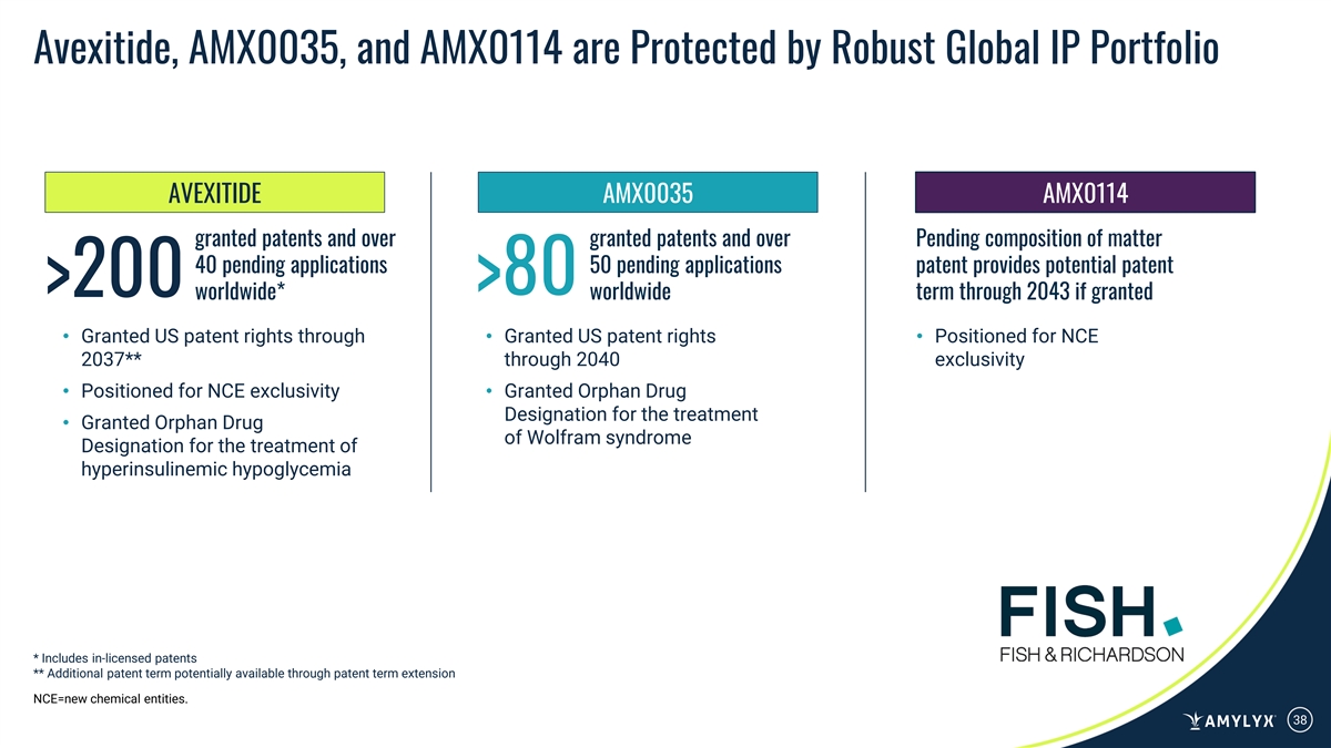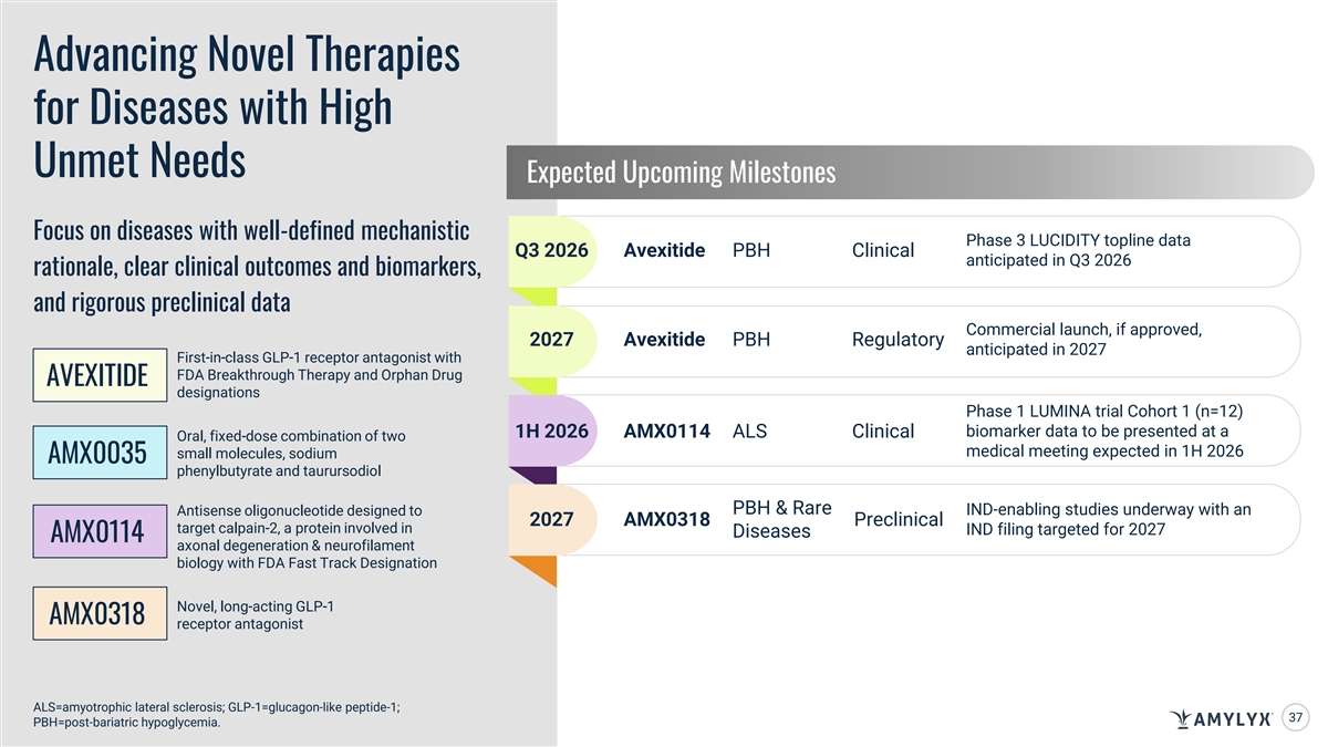 Advancing Novel Therapies for Diseases with High Unmet Needs Expected Upcoming Milestones Focus on diseases with well-defined mechanistic Phase 3 LUCIDITY topline data Q3 2026 Avexitide PBH Clinical anticipated in Q3 2026 rationale, clear clinical outcomes and biomarkers, and rigorous preclinical data Commercial launch, if approved, 2027 Avexitide PBH Regulatory anticipated in 2027 First-in-class GLP-1 receptor antagonist with FDA Breakthrough Therapy and Orphan Drug AVEXITIDE designations Phase 1 LUMINA trial Cohort 1 (n=12) biomarker data to be presented at a 1H 2026 AMX0114 ALS Clinical Oral, fixed-dose combination of two medical meeting expected in 1H 2026 small molecules, sodium AMX0035 phenylbutyrate and taurursodiol PBH & Rare IND-enabling studies underway with an Antisense oligonucleotide designed to 2027 AMX0318 Preclinical target calpain-2, a protein involved in IND filing targeted for 2027 Diseases AMX0114 axonal degeneration & neurofilament biology with FDA Fast Track Designation Novel, long-acting GLP-1 AMX0318 receptor antagonist ALS=amyotrophic lateral sclerosis; GLP-1=glucagon-like peptide-1; 37 PBH=post-bariatric hypoglycemia.