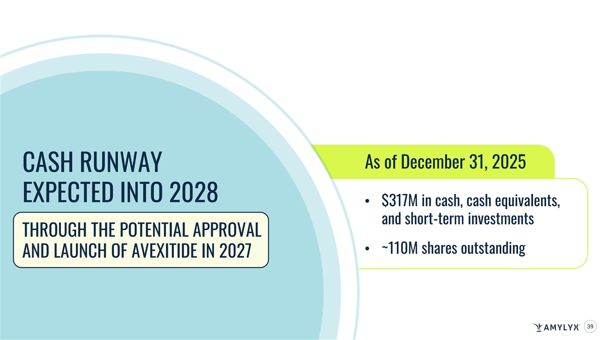 As of December 31, 2025 CASH RUNWAY EXPECTED INTO 2028 • $317M in cash, cash equivalents, and short-term investments THROUGH THE POTENTIAL APPROVAL • ~110M shares outstanding AND LAUNCH OF AVEXITIDE IN 2027 39