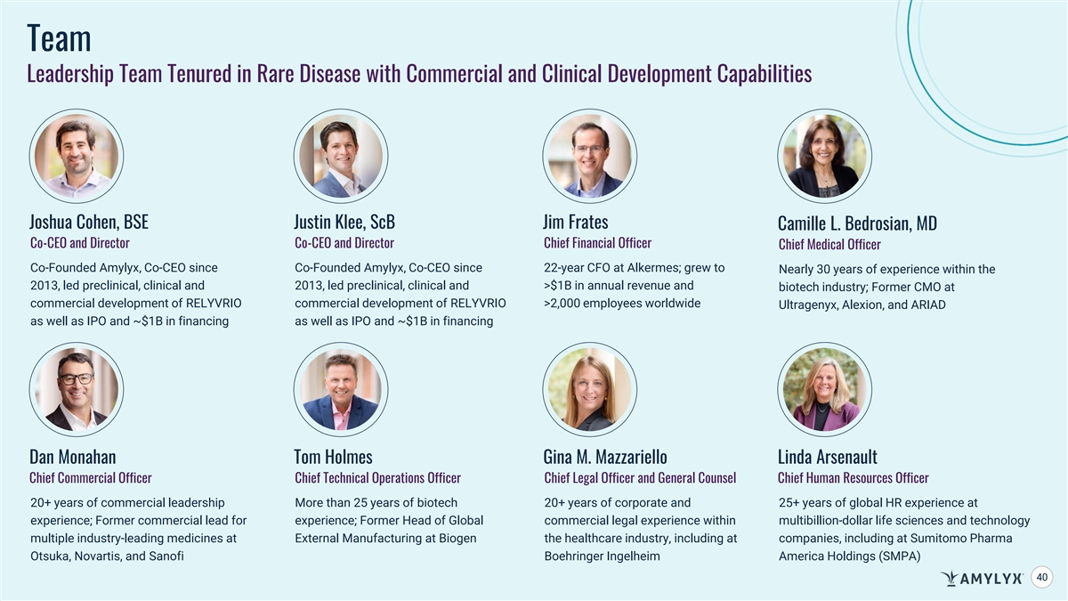 Team Leadership Team Tenured in Rare Disease with Commercial and Clinical Development Capabilities Joshua Cohen, BSE Justin Klee, ScB Jim Frates Camille L. Bedrosian, MD Co-CEO and Director Co-CEO and Director Chief Financial Officer Chief Medical Officer Co-Founded Amylyx, Co-CEO since Co-Founded Amylyx, Co-CEO since 22-year CFO at Alkermes; grew to Nearly 30 years of experience within the 2013, led preclinical, clinical and 2013, led preclinical, clinical and >$1B in annual revenue and biotech industry; Former CMO at commercial development of RELYVRIO commercial development of RELYVRIO >2,000 employees worldwide Ultragenyx, Alexion, and ARIAD as well as IPO and ~$1B in financing as well as IPO and ~$1B in financing Dan Monahan Tom Holmes Gina M. Mazzariello Linda Arsenault Chief Commercial Officer Chief Technical Operations Officer Chief Legal Officer and General Counsel Chief Human Resources Officer 20+ years of commercial leadership More than 25 years of biotech 20+ years of corporate and 25+ years of global HR experience at experience; Former commercial lead for experience; Former Head of Global commercial legal experience within multibillion-dollar life sciences and technology multiple industry-leading medicines at External Manufacturing at Biogen the healthcare industry, including at companies, including at Sumitomo Pharma Otsuka, Novartis, and Sanofi Boehringer Ingelheim America Holdings (SMPA) 40