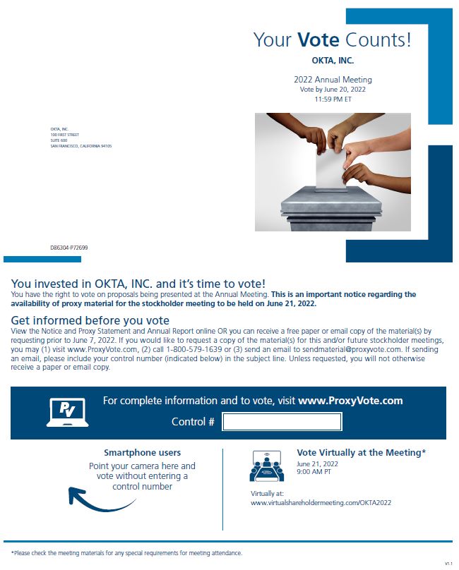 Your Vote Counts! OKTA, INC. 2022 Annual Meeting Vote by June 20, 2022 11:59 PM ET OKTA, INC. 100 FIRST STREET SUITE 600 SAN FRANCISCO, CALIFORNIA 94105 D86304-P72699 You invested in OKTA, INC. and it’s time to vote! You