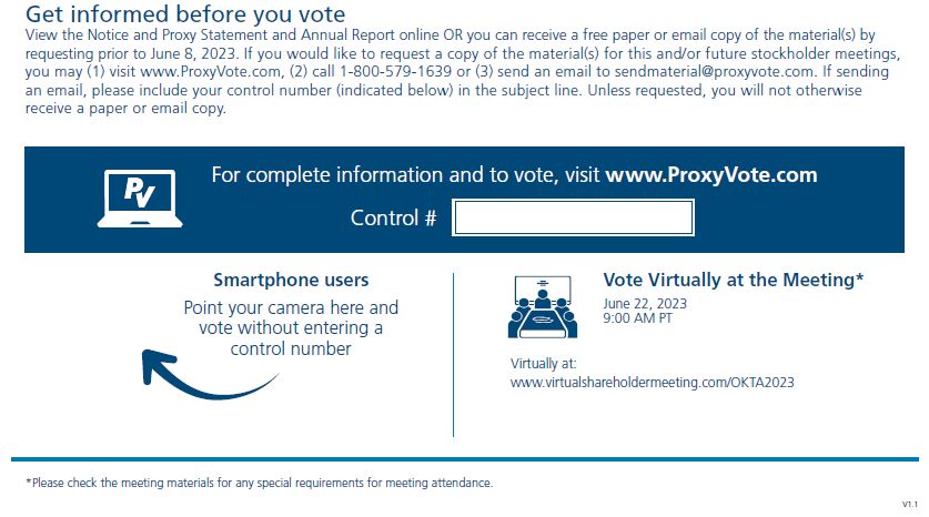 without entering a control numberVote Virtually at the Meeting*June 22, 20239:00 AM PTVirtually at:www.virtualshareholdermeeting.com/OKTA2023*Please check the meeting materials for