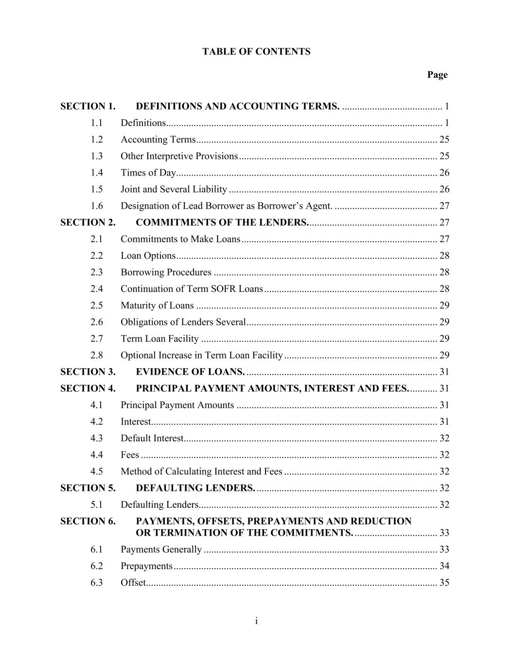 TABLE OF CONTENTS Page i SECTION 1. DEFINITIONS AND ACCOUNTING TERMS. ........................................ 1 1.1 Definitions.............................................................................................................. 1 1.2 Accounting Terms ................................................................................................ 25 1.3 Other Interpretive Provisions ............................................................................... 25 1.4 Times of Day........................................................................................................ 26 1.5 Joint and Several Liability ................................................................................... 26 1.6 Designation of Lead Borrower as Borrower’s Agent. ......................................... 27 SECTION 2. COMMITMENTS OF THE LENDERS. ................................................... 27 2.1 Commitments to Make Loans .............................................................................. 27 2.2 Loan Options ........................................................................................................ 28 2.3 Borrowing Procedures ......................................................................................... 28 2.4 Continuation of Term SOFR Loans ..................................................................... 28 2.5 Maturity of Loans ................................................................................................ 29 2.6 Obligations of Lenders Several ............................................................................ 29 2.7 Term Loan Facility .............................................................................................. 29 2.8 Optional Increase in Term Loan Facility ............................................................. 29 SECTION 3. EVIDENCE OF LOANS. ............................................................................ 31 SECTION 4. PRINCIPAL PAYMENT AMOUNTS, INTEREST AND FEES. ........... 31 4.1 Principal Payment Amounts ................................................................................ 31 4.2 Interest.................................................................................................................. 31 4.3 Default Interest..................................................................................................... 32 4.4 Fees ...................................................................................................................... 32 4.5 Method of Calculating Interest and Fees ............................................................. 32 SECTION 5. DEFAULTING LENDERS. ........................................................................ 32 5.1 Defaulting Lenders ............................................................................................... 32 SECTION 6. PAYMENTS, OFFSETS, PREPAYMENTS AND REDUCTION OR TERMINATION OF THE COMMITMENTS. ................................. 33 6.1 Payments Generally ............................................................................................. 33 6.2 Prepayments ......................................................................................................... 34 6.3 Offset.................................................................................................................... 35