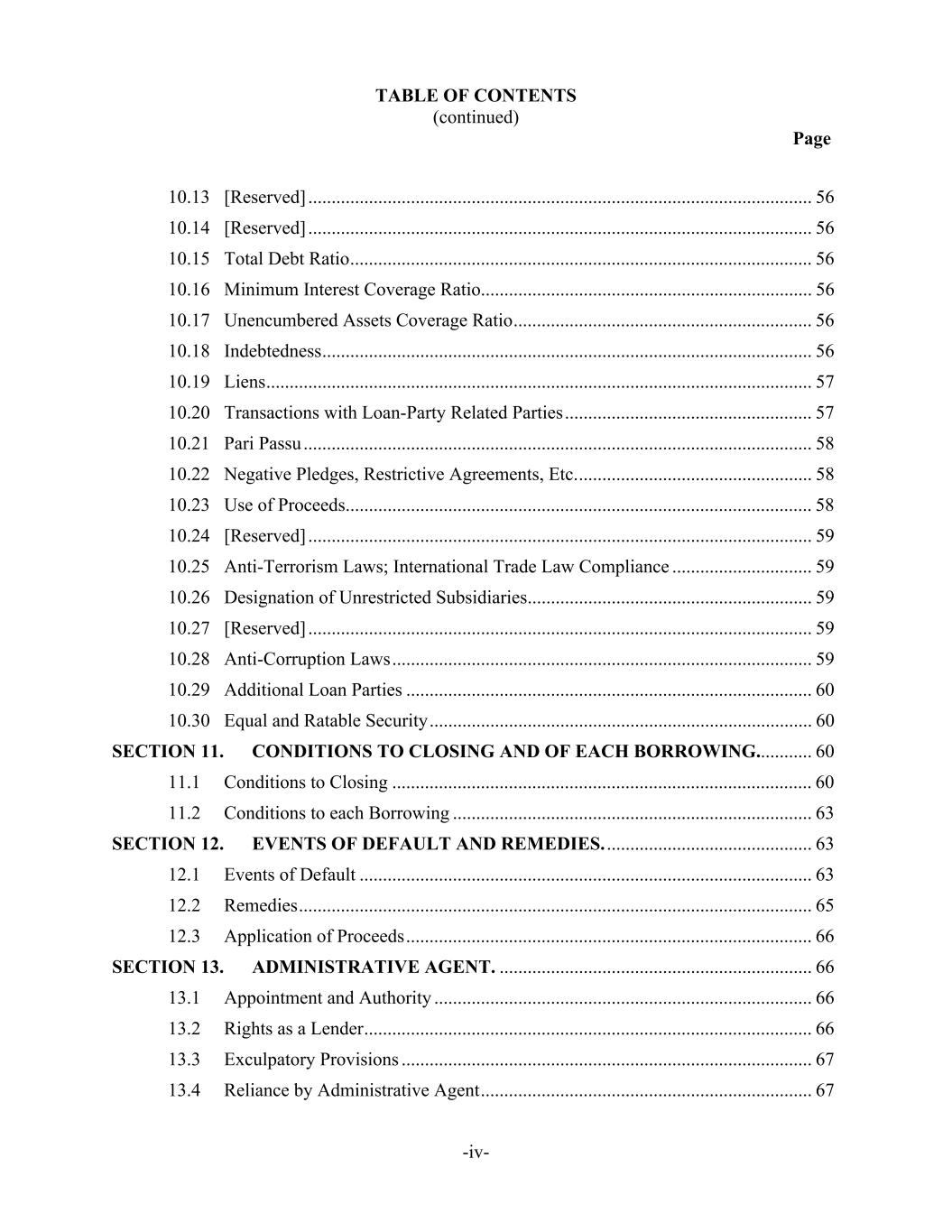 TABLE OF CONTENTS (continued) Page -iv- 10.13 [Reserved] ............................................................................................................ 56 10.14 [Reserved] ............................................................................................................ 56 10.15 Total Debt Ratio ................................................................................................... 56 10.16 Minimum Interest Coverage Ratio....................................................................... 56 10.17 Unencumbered Assets Coverage Ratio ................................................................ 56 10.18 Indebtedness ......................................................................................................... 56 10.19 Liens ..................................................................................................................... 57 10.20 Transactions with Loan-Party Related Parties ..................................................... 57 10.21 Pari Passu ............................................................................................................. 58 10.22 Negative Pledges, Restrictive Agreements, Etc. .................................................. 58 10.23 Use of Proceeds .................................................................................................... 58 10.24 [Reserved] ............................................................................................................ 59 10.25 Anti-Terrorism Laws; International Trade Law Compliance .............................. 59 10.26 Designation of Unrestricted Subsidiaries ............................................................. 59 10.27 [Reserved] ............................................................................................................ 59 10.28 Anti-Corruption Laws .......................................................................................... 59 10.29 Additional Loan Parties ....................................................................................... 60 10.30 Equal and Ratable Security .................................................................................. 60 SECTION 11. CONDITIONS TO CLOSING AND OF EACH BORROWING............ 60 11.1 Conditions to Closing .......................................................................................... 60 11.2 Conditions to each Borrowing ............................................................................. 63 SECTION 12. EVENTS OF DEFAULT AND REMEDIES. ............................................ 63 12.1 Events of Default ................................................................................................. 63 12.2 Remedies .............................................................................................................. 65 12.3 Application of Proceeds ....................................................................................... 66 SECTION 13. ADMINISTRATIVE AGENT. ................................................................... 66 13.1 Appointment and Authority ................................................................................. 66 13.2 Rights as a Lender ................................................................................................ 66 13.3 Exculpatory Provisions ........................................................................................ 67 13.4 Reliance by Administrative Agent ....................................................................... 67