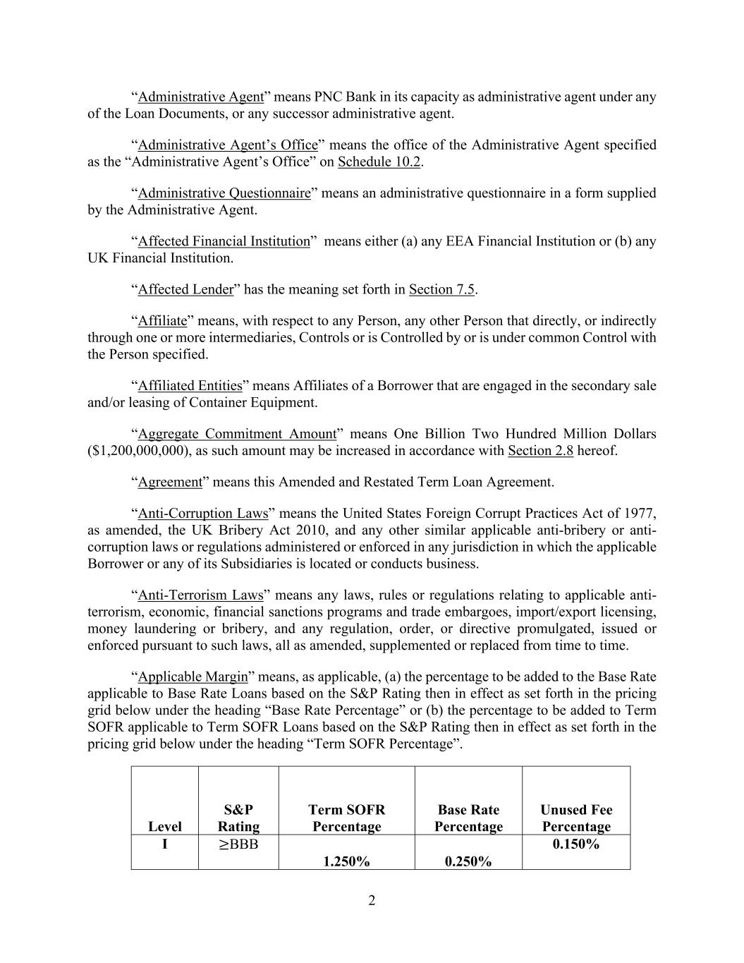 2 “Administrative Agent” means PNC Bank in its capacity as administrative agent under any of the Loan Documents, or any successor administrative agent. “Administrative Agent’s Office” means the office of the Administrative Agent specified as the “Administrative Agent’s Office” on Schedule 10.2. “Administrative Questionnaire” means an administrative questionnaire in a form supplied by the Administrative Agent. “Affected Financial Institution” means either (a) any EEA Financial Institution or (b) any UK Financial Institution. “Affected Lender” has the meaning set forth in Section 7.5. “Affiliate” means, with respect to any Person, any other Person that directly, or indirectly through one or more intermediaries, Controls or is Controlled by or is under common Control with the Person specified. “Affiliated Entities” means Affiliates of a Borrower that are engaged in the secondary sale and/or leasing of Container Equipment. “Aggregate Commitment Amount” means One Billion Two Hundred Million Dollars ($1,200,000,000), as such amount may be increased in accordance with Section 2.8 hereof. “Agreement” means this Amended and Restated Term Loan Agreement. “Anti-Corruption Laws” means the United States Foreign Corrupt Practices Act of 1977, as amended, the UK Bribery Act 2010, and any other similar applicable anti-bribery or anti- corruption laws or regulations administered or enforced in any jurisdiction in which the applicable Borrower or any of its Subsidiaries is located or conducts business. “Anti-Terrorism Laws” means any laws, rules or regulations relating to applicable anti- terrorism, economic, financial sanctions programs and trade embargoes, import/export licensing, money laundering or bribery, and any regulation, order, or directive promulgated, issued or enforced pursuant to such laws, all as amended, supplemented or replaced from time to time. “Applicable Margin” means, as applicable, (a) the percentage to be added to the Base Rate applicable to Base Rate Loans based on the S&P Rating then in effect as set forth in the pricing grid below under the heading “Base Rate Percentage” or (b) the percentage to be added to Term SOFR applicable to Term SOFR Loans based on the S&P Rating then in effect as set forth in the pricing grid below under the heading “Term SOFR Percentage”. Level S&P Rating Term SOFR Percentage Base Rate Percentage Unused Fee Percentage I BBB 1.250% 0.250% 0.150%