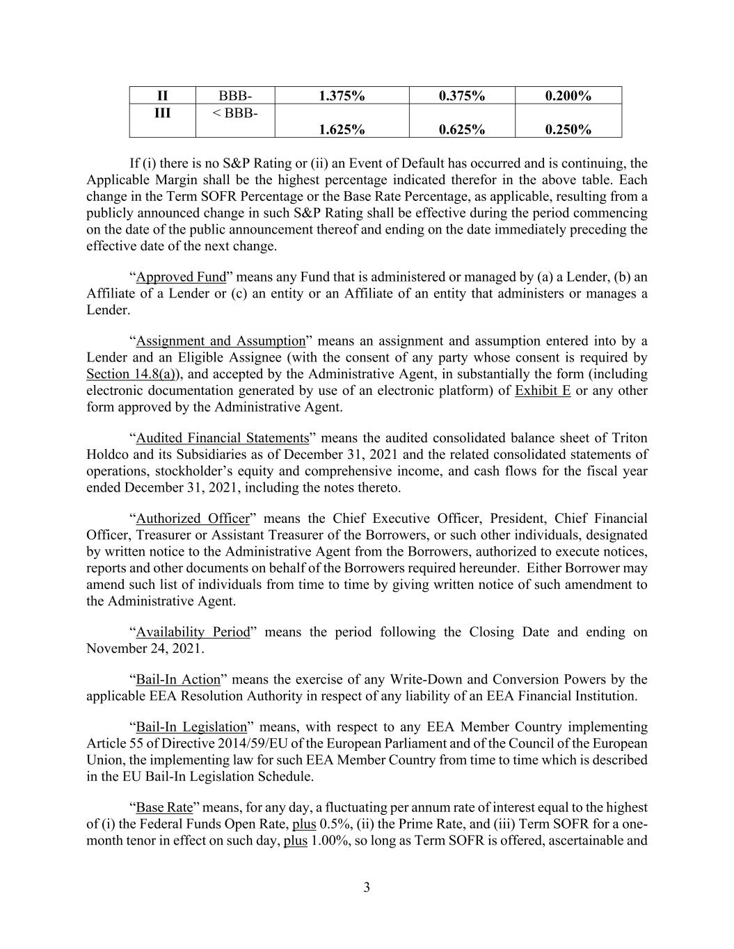 3 II BBB- 1.375% 0.375% 0.200% III < BBB- 1.625% 0.625% 0.250% If (i) there is no S&P Rating or (ii) an Event of Default has occurred and is continuing, the Applicable Margin shall be the highest percentage indicated therefor in the above table. Each change in the Term SOFR Percentage or the Base Rate Percentage, as applicable, resulting from a publicly announced change in such S&P Rating shall be effective during the period commencing on the date of the public announcement thereof and ending on the date immediately preceding the effective date of the next change. “Approved Fund” means any Fund that is administered or managed by (a) a Lender, (b) an Affiliate of a Lender or (c) an entity or an Affiliate of an entity that administers or manages a Lender. “Assignment and Assumption” means an assignment and assumption entered into by a Lender and an Eligible Assignee (with the consent of any party whose consent is required by Section 14.8(a)), and accepted by the Administrative Agent, in substantially the form (including electronic documentation generated by use of an electronic platform) of Exhibit E or any other form approved by the Administrative Agent. “Audited Financial Statements” means the audited consolidated balance sheet of Triton Holdco and its Subsidiaries as of December 31, 2021 and the related consolidated statements of operations, stockholder’s equity and comprehensive income, and cash flows for the fiscal year ended December 31, 2021, including the notes thereto. “Authorized Officer” means the Chief Executive Officer, President, Chief Financial Officer, Treasurer or Assistant Treasurer of the Borrowers, or such other individuals, designated by written notice to the Administrative Agent from the Borrowers, authorized to execute notices, reports and other documents on behalf of the Borrowers required hereunder. Either Borrower may amend such list of individuals from time to time by giving written notice of such amendment to the Administrative Agent. “Availability Period” means the period following the Closing Date and ending on November 24, 2021. “Bail-In Action” means the exercise of any Write-Down and Conversion Powers by the applicable EEA Resolution Authority in respect of any liability of an EEA Financial Institution. “Bail-In Legislation” means, with respect to any EEA Member Country implementing Article 55 of Directive 2014/59/EU of the European Parliament and of the Council of the European Union, the implementing law for such EEA Member Country from time to time which is described in the EU Bail-In Legislation Schedule. “Base Rate” means, for any day, a fluctuating per annum rate of interest equal to the highest of (i) the Federal Funds Open Rate, plus 0.5%, (ii) the Prime Rate, and (iii) Term SOFR for a one- month tenor in effect on such day, plus 1.00%, so long as Term SOFR is offered, ascertainable and