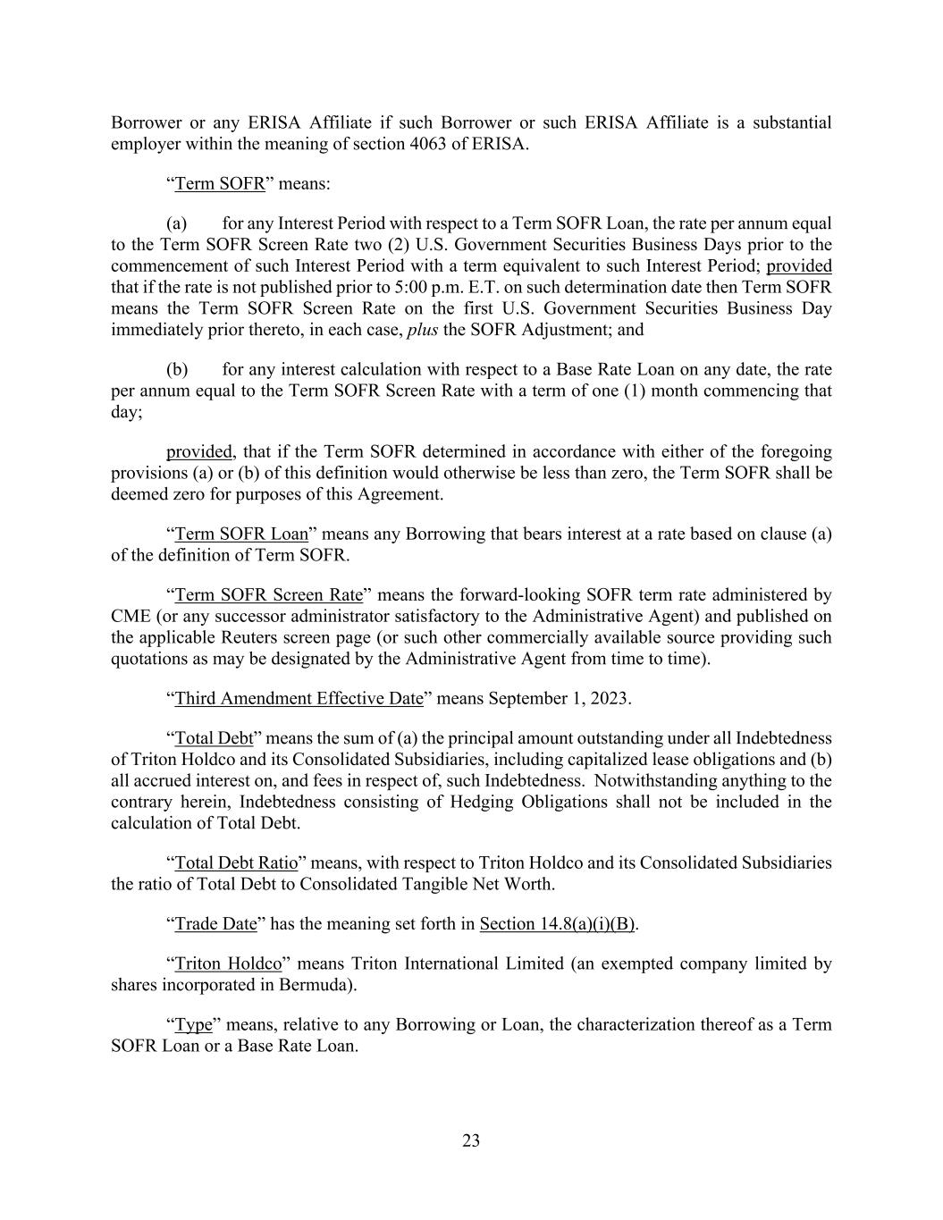 23 Borrower or any ERISA Affiliate if such Borrower or such ERISA Affiliate is a substantial employer within the meaning of section 4063 of ERISA. “Term SOFR” means: (a) for any Interest Period with respect to a Term SOFR Loan, the rate per annum equal to the Term SOFR Screen Rate two (2) U.S. Government Securities Business Days prior to the commencement of such Interest Period with a term equivalent to such Interest Period; provided that if the rate is not published prior to 5:00 p.m. E.T. on such determination date then Term SOFR means the Term SOFR Screen Rate on the first U.S. Government Securities Business Day immediately prior thereto, in each case, plus the SOFR Adjustment; and (b) for any interest calculation with respect to a Base Rate Loan on any date, the rate per annum equal to the Term SOFR Screen Rate with a term of one (1) month commencing that day; provided, that if the Term SOFR determined in accordance with either of the foregoing provisions (a) or (b) of this definition would otherwise be less than zero, the Term SOFR shall be deemed zero for purposes of this Agreement. “Term SOFR Loan” means any Borrowing that bears interest at a rate based on clause (a) of the definition of Term SOFR. “Term SOFR Screen Rate” means the forward-looking SOFR term rate administered by CME (or any successor administrator satisfactory to the Administrative Agent) and published on the applicable Reuters screen page (or such other commercially available source providing such quotations as may be designated by the Administrative Agent from time to time). “Third Amendment Effective Date” means September 1, 2023. “Total Debt” means the sum of (a) the principal amount outstanding under all Indebtedness of Triton Holdco and its Consolidated Subsidiaries, including capitalized lease obligations and (b) all accrued interest on, and fees in respect of, such Indebtedness. Notwithstanding anything to the contrary herein, Indebtedness consisting of Hedging Obligations shall not be included in the calculation of Total Debt. “Total Debt Ratio” means, with respect to Triton Holdco and its Consolidated Subsidiaries the ratio of Total Debt to Consolidated Tangible Net Worth. “Trade Date” has the meaning set forth in Section 14.8(a)(i)(B). “Triton Holdco” means Triton International Limited (an exempted company limited by shares incorporated in Bermuda). “Type” means, relative to any Borrowing or Loan, the characterization thereof as a Term SOFR Loan or a Base Rate Loan.
