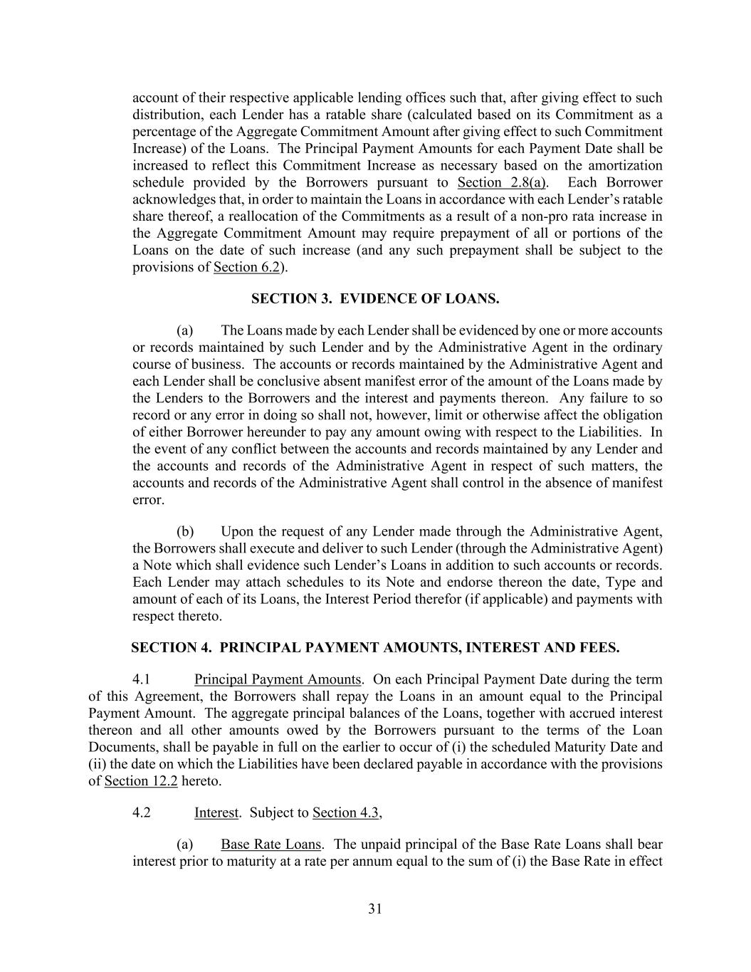 31 account of their respective applicable lending offices such that, after giving effect to such distribution, each Lender has a ratable share (calculated based on its Commitment as a percentage of the Aggregate Commitment Amount after giving effect to such Commitment Increase) of the Loans. The Principal Payment Amounts for each Payment Date shall be increased to reflect this Commitment Increase as necessary based on the amortization schedule provided by the Borrowers pursuant to Section 2.8(a). Each Borrower acknowledges that, in order to maintain the Loans in accordance with each Lender’s ratable share thereof, a reallocation of the Commitments as a result of a non-pro rata increase in the Aggregate Commitment Amount may require prepayment of all or portions of the Loans on the date of such increase (and any such prepayment shall be subject to the provisions of Section 6.2). SECTION 3. EVIDENCE OF LOANS. (a) The Loans made by each Lender shall be evidenced by one or more accounts or records maintained by such Lender and by the Administrative Agent in the ordinary course of business. The accounts or records maintained by the Administrative Agent and each Lender shall be conclusive absent manifest error of the amount of the Loans made by the Lenders to the Borrowers and the interest and payments thereon. Any failure to so record or any error in doing so shall not, however, limit or otherwise affect the obligation of either Borrower hereunder to pay any amount owing with respect to the Liabilities. In the event of any conflict between the accounts and records maintained by any Lender and the accounts and records of the Administrative Agent in respect of such matters, the accounts and records of the Administrative Agent shall control in the absence of manifest error. (b) Upon the request of any Lender made through the Administrative Agent, the Borrowers shall execute and deliver to such Lender (through the Administrative Agent) a Note which shall evidence such Lender’s Loans in addition to such accounts or records. Each Lender may attach schedules to its Note and endorse thereon the date, Type and amount of each of its Loans, the Interest Period therefor (if applicable) and payments with respect thereto. SECTION 4. PRINCIPAL PAYMENT AMOUNTS, INTEREST AND FEES. 4.1 Principal Payment Amounts. On each Principal Payment Date during the term of this Agreement, the Borrowers shall repay the Loans in an amount equal to the Principal Payment Amount. The aggregate principal balances of the Loans, together with accrued interest thereon and all other amounts owed by the Borrowers pursuant to the terms of the Loan Documents, shall be payable in full on the earlier to occur of (i) the scheduled Maturity Date and (ii) the date on which the Liabilities have been declared payable in accordance with the provisions of Section 12.2 hereto. 4.2 Interest. Subject to Section 4.3, (a) Base Rate Loans. The unpaid principal of the Base Rate Loans shall bear interest prior to maturity at a rate per annum equal to the sum of (i) the Base Rate in effect