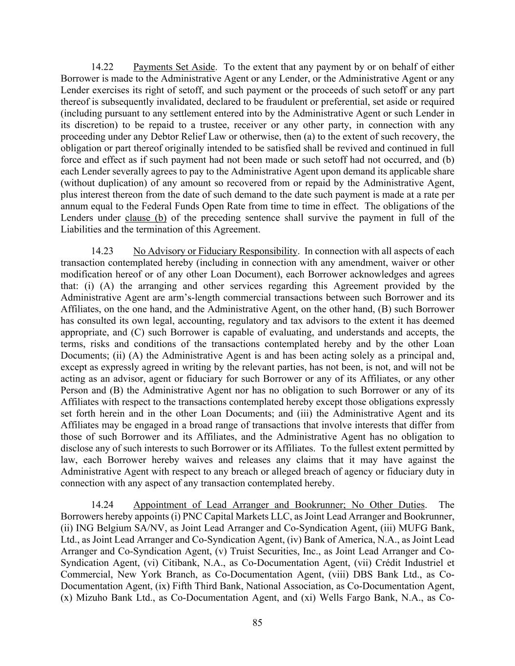 85 14.22 Payments Set Aside. To the extent that any payment by or on behalf of either Borrower is made to the Administrative Agent or any Lender, or the Administrative Agent or any Lender exercises its right of setoff, and such payment or the proceeds of such setoff or any part thereof is subsequently invalidated, declared to be fraudulent or preferential, set aside or required (including pursuant to any settlement entered into by the Administrative Agent or such Lender in its discretion) to be repaid to a trustee, receiver or any other party, in connection with any proceeding under any Debtor Relief Law or otherwise, then (a) to the extent of such recovery, the obligation or part thereof originally intended to be satisfied shall be revived and continued in full force and effect as if such payment had not been made or such setoff had not occurred, and (b) each Lender severally agrees to pay to the Administrative Agent upon demand its applicable share (without duplication) of any amount so recovered from or repaid by the Administrative Agent, plus interest thereon from the date of such demand to the date such payment is made at a rate per annum equal to the Federal Funds Open Rate from time to time in effect. The obligations of the Lenders under clause (b) of the preceding sentence shall survive the payment in full of the Liabilities and the termination of this Agreement. 14.23 No Advisory or Fiduciary Responsibility. In connection with all aspects of each transaction contemplated hereby (including in connection with any amendment, waiver or other modification hereof or of any other Loan Document), each Borrower acknowledges and agrees that: (i) (A) the arranging and other services regarding this Agreement provided by the Administrative Agent are arm’s-length commercial transactions between such Borrower and its Affiliates, on the one hand, and the Administrative Agent, on the other hand, (B) such Borrower has consulted its own legal, accounting, regulatory and tax advisors to the extent it has deemed appropriate, and (C) such Borrower is capable of evaluating, and understands and accepts, the terms, risks and conditions of the transactions contemplated hereby and by the other Loan Documents; (ii) (A) the Administrative Agent is and has been acting solely as a principal and, except as expressly agreed in writing by the relevant parties, has not been, is not, and will not be acting as an advisor, agent or fiduciary for such Borrower or any of its Affiliates, or any other Person and (B) the Administrative Agent nor has no obligation to such Borrower or any of its Affiliates with respect to the transactions contemplated hereby except those obligations expressly set forth herein and in the other Loan Documents; and (iii) the Administrative Agent and its Affiliates may be engaged in a broad range of transactions that involve interests that differ from those of such Borrower and its Affiliates, and the Administrative Agent has no obligation to disclose any of such interests to such Borrower or its Affiliates. To the fullest extent permitted by law, each Borrower hereby waives and releases any claims that it may have against the Administrative Agent with respect to any breach or alleged breach of agency or fiduciary duty in connection with any aspect of any transaction contemplated hereby. 14.24 Appointment of Lead Arranger and Bookrunner; No Other Duties. The Borrowers hereby appoints (i) PNC Capital Markets LLC, as Joint Lead Arranger and Bookrunner, (ii) ING Belgium SA/NV, as Joint Lead Arranger and Co-Syndication Agent, (iii) MUFG Bank, Ltd., as Joint Lead Arranger and Co-Syndication Agent, (iv) Bank of America, N.A., as Joint Lead Arranger and Co-Syndication Agent, (v) Truist Securities, Inc., as Joint Lead Arranger and Co- Syndication Agent, (vi) Citibank, N.A., as Co-Documentation Agent, (vii) Crédit Industriel et Commercial, New York Branch, as Co-Documentation Agent, (viii) DBS Bank Ltd., as Co- Documentation Agent, (ix) Fifth Third Bank, National Association, as Co-Documentation Agent, (x) Mizuho Bank Ltd., as Co-Documentation Agent, and (xi) Wells Fargo Bank, N.A., as Co-