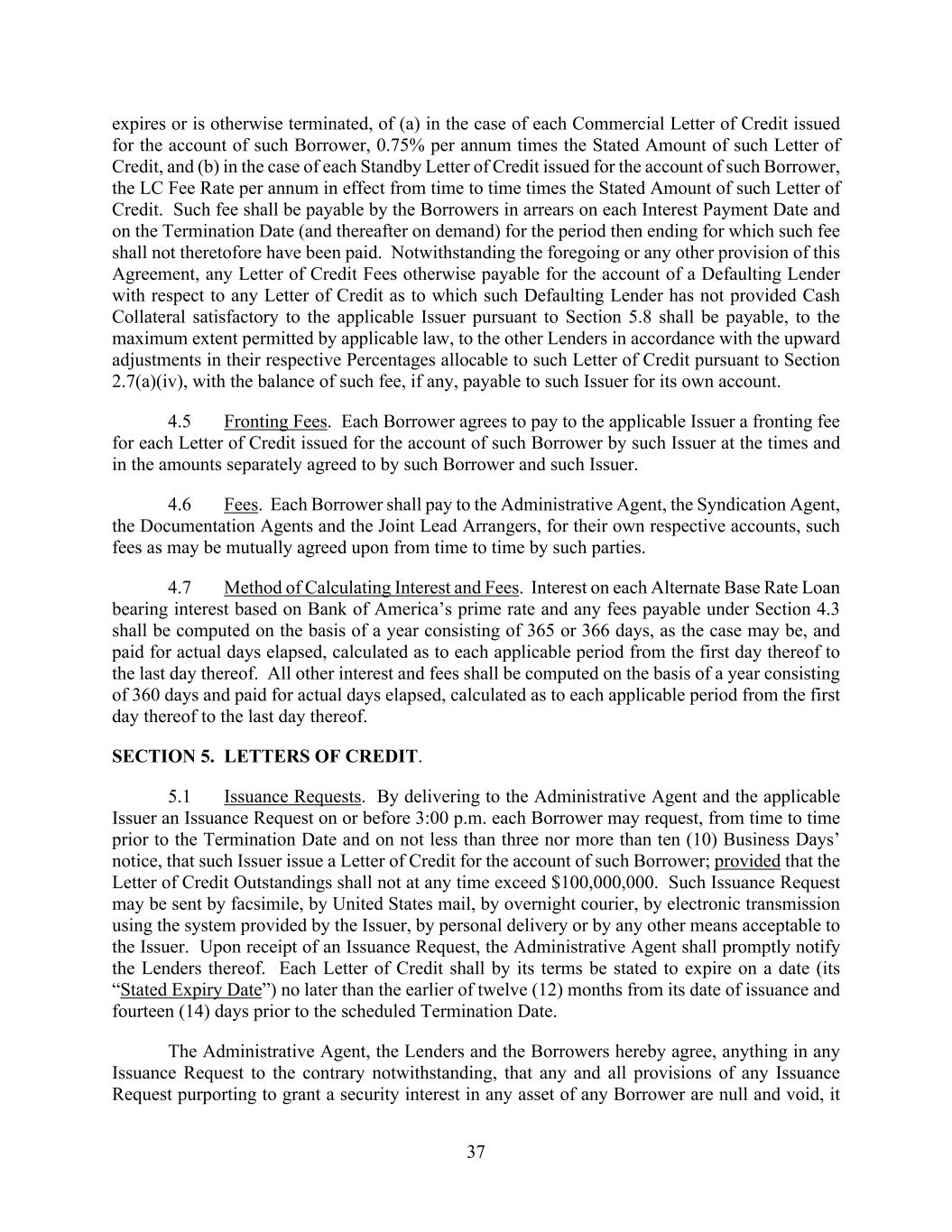 37 expires or is otherwise terminated, of (a) in the case of each Commercial Letter of Credit issued for the account of such Borrower, 0.75% per annum times the Stated Amount of such Letter of Credit, and (b) in the case of each Standby Letter of Credit issued for the account of such Borrower, the LC Fee Rate per annum in effect from time to time times the Stated Amount of such Letter of Credit. Such fee shall be payable by the Borrowers in arrears on each Interest Payment Date and on the Termination Date (and thereafter on demand) for the period then ending for which such fee shall not theretofore have been paid. Notwithstanding the foregoing or any other provision of this Agreement, any Letter of Credit Fees otherwise payable for the account of a Defaulting Lender with respect to any Letter of Credit as to which such Defaulting Lender has not provided Cash Collateral satisfactory to the applicable Issuer pursuant to Section 5.8 shall be payable, to the maximum extent permitted by applicable law, to the other Lenders in accordance with the upward adjustments in their respective Percentages allocable to such Letter of Credit pursuant to Section 2.7(a)(iv), with the balance of such fee, if any, payable to such Issuer for its own account. 4.5 Fronting Fees. Each Borrower agrees to pay to the applicable Issuer a fronting fee for each Letter of Credit issued for the account of such Borrower by such Issuer at the times and in the amounts separately agreed to by such Borrower and such Issuer. 4.6 Fees. Each Borrower shall pay to the Administrative Agent, the Syndication Agent, the Documentation Agents and the Joint Lead Arrangers, for their own respective accounts, such fees as may be mutually agreed upon from time to time by such parties. 4.7 Method of Calculating Interest and Fees. Interest on each Alternate Base Rate Loan bearing interest based on Bank of America’s prime rate and any fees payable under Section 4.3 shall be computed on the basis of a year consisting of 365 or 366 days, as the case may be, and paid for actual days elapsed, calculated as to each applicable period from the first day thereof to the last day thereof. All other interest and fees shall be computed on the basis of a year consisting of 360 days and paid for actual days elapsed, calculated as to each applicable period from the first day thereof to the last day thereof. SECTION 5. LETTERS OF CREDIT. 5.1 Issuance Requests. By delivering to the Administrative Agent and the applicable Issuer an Issuance Request on or before 3:00 p.m. each Borrower may request, from time to time prior to the Termination Date and on not less than three nor more than ten (10) Business Days’ notice, that such Issuer issue a Letter of Credit for the account of such Borrower; provided that the Letter of Credit Outstandings shall not at any time exceed $100,000,000. Such Issuance Request may be sent by facsimile, by United States mail, by overnight courier, by electronic transmission using the system provided by the Issuer, by personal delivery or by any other means acceptable to the Issuer. Upon receipt of an Issuance Request, the Administrative Agent shall promptly notify the Lenders thereof. Each Letter of Credit shall by its terms be stated to expire on a date (its “Stated Expiry Date”) no later than the earlier of twelve (12) months from its date of issuance and fourteen (14) days prior to the scheduled Termination Date. The Administrative Agent, the Lenders and the Borrowers hereby agree, anything in any Issuance Request to the contrary notwithstanding, that any and all provisions of any Issuance Request purporting to grant a security interest in any asset of any Borrower are null and void, it