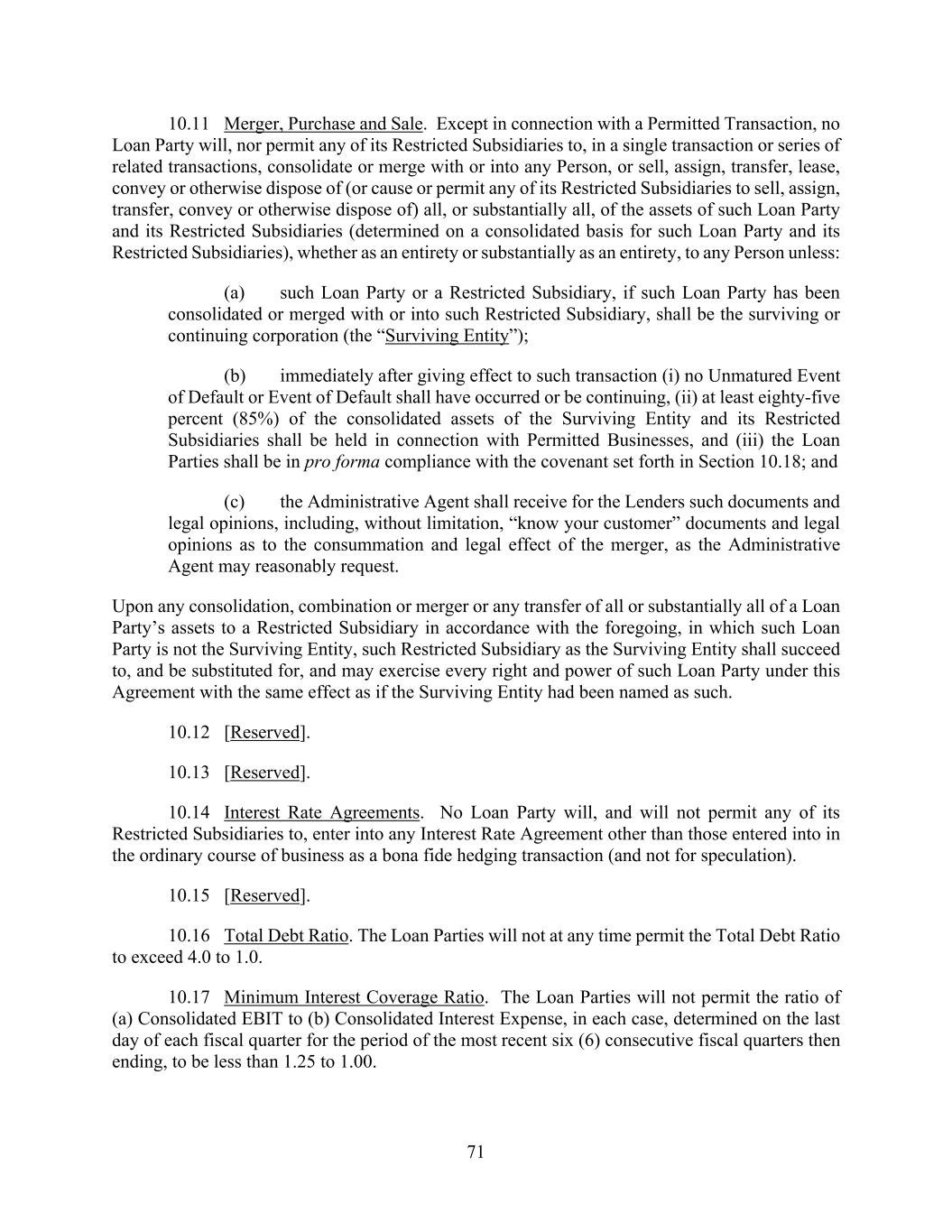 71 10.11 Merger, Purchase and Sale. Except in connection with a Permitted Transaction, no Loan Party will, nor permit any of its Restricted Subsidiaries to, in a single transaction or series of related transactions, consolidate or merge with or into any Person, or sell, assign, transfer, lease, convey or otherwise dispose of (or cause or permit any of its Restricted Subsidiaries to sell, assign, transfer, convey or otherwise dispose of) all, or substantially all, of the assets of such Loan Party and its Restricted Subsidiaries (determined on a consolidated basis for such Loan Party and its Restricted Subsidiaries), whether as an entirety or substantially as an entirety, to any Person unless: (a) such Loan Party or a Restricted Subsidiary, if such Loan Party has been consolidated or merged with or into such Restricted Subsidiary, shall be the surviving or continuing corporation (the “Surviving Entity”); (b) immediately after giving effect to such transaction (i) no Unmatured Event of Default or Event of Default shall have occurred or be continuing, (ii) at least eighty-five percent (85%) of the consolidated assets of the Surviving Entity and its Restricted Subsidiaries shall be held in connection with Permitted Businesses, and (iii) the Loan Parties shall be in pro forma compliance with the covenant set forth in Section 10.18; and (c) the Administrative Agent shall receive for the Lenders such documents and legal opinions, including, without limitation, “know your customer” documents and legal opinions as to the consummation and legal effect of the merger, as the Administrative Agent may reasonably request. Upon any consolidation, combination or merger or any transfer of all or substantially all of a Loan Party’s assets to a Restricted Subsidiary in accordance with the foregoing, in which such Loan Party is not the Surviving Entity, such Restricted Subsidiary as the Surviving Entity shall succeed to, and be substituted for, and may exercise every right and power of such Loan Party under this Agreement with the same effect as if the Surviving Entity had been named as such. 10.12 [Reserved]. 10.13 [Reserved]. 10.14 Interest Rate Agreements. No Loan Party will, and will not permit any of its Restricted Subsidiaries to, enter into any Interest Rate Agreement other than those entered into in the ordinary course of business as a bona fide hedging transaction (and not for speculation). 10.15 [Reserved]. 10.16 Total Debt Ratio. The Loan Parties will not at any time permit the Total Debt Ratio to exceed 4.0 to 1.0. 10.17 Minimum Interest Coverage Ratio. The Loan Parties will not permit the ratio of (a) Consolidated EBIT to (b) Consolidated Interest Expense, in each case, determined on the last day of each fiscal quarter for the period of the most recent six (6) consecutive fiscal quarters then ending, to be less than 1.25 to 1.00.