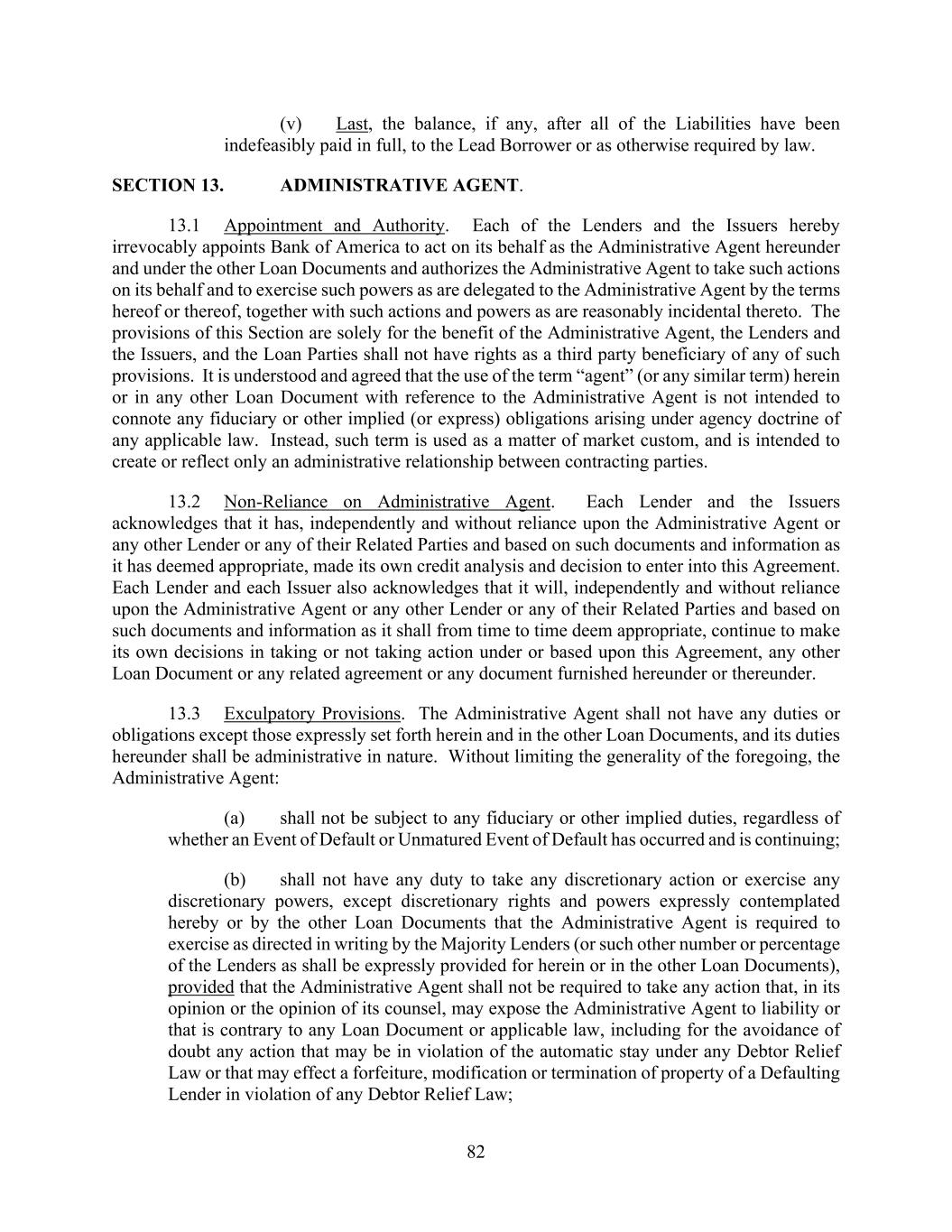 82 (v) Last, the balance, if any, after all of the Liabilities have been indefeasibly paid in full, to the Lead Borrower or as otherwise required by law. SECTION 13. ADMINISTRATIVE AGENT. 13.1 Appointment and Authority. Each of the Lenders and the Issuers hereby irrevocably appoints Bank of America to act on its behalf as the Administrative Agent hereunder and under the other Loan Documents and authorizes the Administrative Agent to take such actions on its behalf and to exercise such powers as are delegated to the Administrative Agent by the terms hereof or thereof, together with such actions and powers as are reasonably incidental thereto. The provisions of this Section are solely for the benefit of the Administrative Agent, the Lenders and the Issuers, and the Loan Parties shall not have rights as a third party beneficiary of any of such provisions. It is understood and agreed that the use of the term “agent” (or any similar term) herein or in any other Loan Document with reference to the Administrative Agent is not intended to connote any fiduciary or other implied (or express) obligations arising under agency doctrine of any applicable law. Instead, such term is used as a matter of market custom, and is intended to create or reflect only an administrative relationship between contracting parties. 13.2 Non-Reliance on Administrative Agent. Each Lender and the Issuers acknowledges that it has, independently and without reliance upon the Administrative Agent or any other Lender or any of their Related Parties and based on such documents and information as it has deemed appropriate, made its own credit analysis and decision to enter into this Agreement. Each Lender and each Issuer also acknowledges that it will, independently and without reliance upon the Administrative Agent or any other Lender or any of their Related Parties and based on such documents and information as it shall from time to time deem appropriate, continue to make its own decisions in taking or not taking action under or based upon this Agreement, any other Loan Document or any related agreement or any document furnished hereunder or thereunder. 13.3 Exculpatory Provisions. The Administrative Agent shall not have any duties or obligations except those expressly set forth herein and in the other Loan Documents, and its duties hereunder shall be administrative in nature. Without limiting the generality of the foregoing, the Administrative Agent: (a) shall not be subject to any fiduciary or other implied duties, regardless of whether an Event of Default or Unmatured Event of Default has occurred and is continuing; (b) shall not have any duty to take any discretionary action or exercise any discretionary powers, except discretionary rights and powers expressly contemplated hereby or by the other Loan Documents that the Administrative Agent is required to exercise as directed in writing by the Majority Lenders (or such other number or percentage of the Lenders as shall be expressly provided for herein or in the other Loan Documents), provided that the Administrative Agent shall not be required to take any action that, in its opinion or the opinion of its counsel, may expose the Administrative Agent to liability or that is contrary to any Loan Document or applicable law, including for the avoidance of doubt any action that may be in violation of the automatic stay under any Debtor Relief Law or that may effect a forfeiture, modification or termination of property of a Defaulting Lender in violation of any Debtor Relief Law;