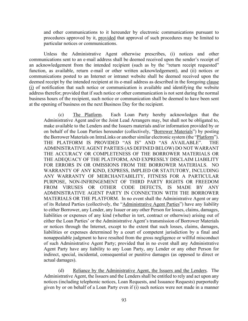 93 and other communications to it hereunder by electronic communications pursuant to procedures approved by it, provided that approval of such procedures may be limited to particular notices or communications. Unless the Administrative Agent otherwise prescribes, (i) notices and other communications sent to an e-mail address shall be deemed received upon the sender’s receipt of an acknowledgement from the intended recipient (such as by the “return receipt requested” function, as available, return e-mail or other written acknowledgement), and (ii) notices or communications posted to an Internet or intranet website shall be deemed received upon the deemed receipt by the intended recipient at its e-mail address as described in the foregoing clause (i) of notification that such notice or communication is available and identifying the website address therefor; provided that if such notice or other communication is not sent during the normal business hours of the recipient, such notice or communication shall be deemed to have been sent at the opening of business on the next Business Day for the recipient. (c) The Platform. Each Loan Party hereby acknowledges that the Administrative Agent and/or the Joint Lead Arrangers may, but shall not be obligated to, make available to the Lenders and the Issuers materials and/or information provided by or on behalf of the Loan Parties hereunder (collectively, “Borrower Materials”) by posting the Borrower Materials on IntraLinks or another similar electronic system (the “Platform”). THE PLATFORM IS PROVIDED “AS IS” AND “AS AVAILABLE”. THE ADMINISTRATIVE AGENT PARTIES (AS DEFINED BELOW) DO NOT WARRANT THE ACCURACY OR COMPLETENESS OF THE BORROWER MATERIALS OR THE ADEQUACY OF THE PLATFORM, AND EXPRESSLY DISCLAIM LIABILITY FOR ERRORS IN OR OMISSIONS FROM THE BORROWER MATERIALS. NO WARRANTY OF ANY KIND, EXPRESS, IMPLIED OR STATUTORY, INCLUDING ANY WARRANTY OF MERCHANTABILITY, FITNESS FOR A PARTICULAR PURPOSE, NON-INFRINGEMENT OF THIRD PARTY RIGHTS OR FREEDOM FROM VIRUSES OR OTHER CODE DEFECTS, IS MADE BY ANY ADMINISTRATIVE AGENT PARTY IN CONNECTION WITH THE BORROWER MATERIALS OR THE PLATFORM. In no event shall the Administrative Agent or any of its Related Parties (collectively, the “Administrative Agent Parties”) have any liability to either Borrower, any Lender, any Issuer or any other Person for losses, claims, damages, liabilities or expenses of any kind (whether in tort, contract or otherwise) arising out of either the Loan Parties’ or the Administrative Agent’s transmission of Borrower Materials or notices through the Internet, except to the extent that such losses, claims, damages, liabilities or expenses determined by a court of competent jurisdiction by a final and nonappealable judgment to have resulted from the gross negligence or willful misconduct of such Administrative Agent Party; provided that in no event shall any Administrative Agent Party have any liability to any Loan Party, any Lender or any other Person for indirect, special, incidental, consequential or punitive damages (as opposed to direct or actual damages). (d) Reliance by the Administrative Agent, the Issuers and the Lenders. The Administrative Agent, the Issuers and the Lenders shall be entitled to rely and act upon any notices (including telephonic notices, Loan Requests, and Issuance Requests) purportedly given by or on behalf of a Loan Party even if (i) such notices were not made in a manner