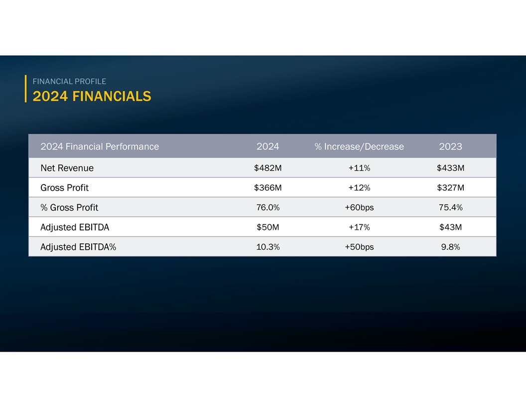 FINANCIAL PROFILE 2024 FINANCIALS 2024 Financial Performance 2024 % Increase/Decrease 2023 $482M +11% $433M Net Revenue Gross Profit $366M +12% $327M 76.0% +60bps 75.4% % Gross Profit $50M +17% $43M Adjusted EBITDA Adjusted EBITDA% 10.3% +50bps 9.8% 18 18
