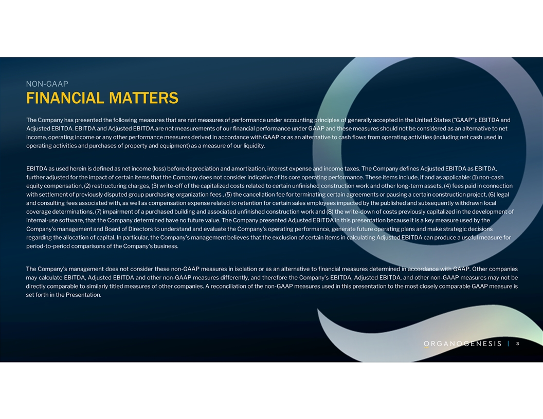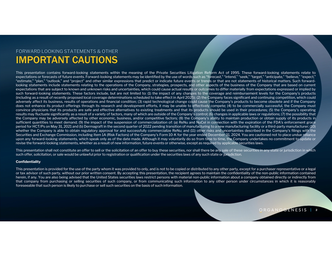 FORWARD LOOKING STATEMENTS & OTHER IMPORTANT CAUTIONS This presentation contains forward-looking statements within the meaning of the Private Securities Litigation Reform Act of 1995. These forward-looking statements relate to expectations or forecasts of future events. Forward-looking statements may be identified by the use of words such as “forecast,” “intend,” “seek,” “target,” “anticipate,” “believe,” “expect,” “estimate,” “plan,” “outlook,” and “project” and other similar expressions that predict or indicate future events or trends or that are not statements of historical matters. Such forward- looking statements include statements relating to the operations of the Company, strategies, prospects, and other aspects of the business of the Company that are based on current expectations that are subject to known and unknown risks and uncertainties, which could cause actual results or outcomes to differ materially from expectations expressed or implied by such forward-looking statements. These factors include, but are not limited to: (1) the impact of any changes to the coverage and reimbursement levels for the Company’s products (including as a result of recently proposed local coverage determinations scheduled to take effect in April 2025); (2) the Company faces significant and continuing competition, which could adversely affect its business, results of operations and financial condition; (3) rapid technological change could cause the Company’s products to become obsolete and if the Company does not enhance its product offerings through its research and development efforts, it may be unable to effectively compete; (4) to be commercially successful, the Company must convince physicians that its products are safe and effective alternatives to existing treatments and that its products should be used in their procedures; (5) the Company’s operating results may fluctuate significantly as a result of a variety of factors, many of which are outside of the Company’s control; (6) changes in applicable laws or regulations; (7) the possibility that the Company may be adversely affected by other economic, business, and/or competitive factors; (8) the Company’s ability to maintain production or obtain supply of its products in sufficient quantities to meet demand; (9) the impact of the suspension of commercialization of: (a) ReNu and NuCel in connection with the expiration of the FDA’s enforcement grace period for HCT/Ps on May 31, 2021 and (b) Dermagraft in the second quarter of 2022 pending transition of manufacturing to a new manufacturing facility or a third-party manufacturer; (10) whether the Company is able to obtain regulatory approval for and successfully commercialize ReNu; and (11) other risks and uncertainties described in the Company’s filings with the Securities and Exchange Commission, including Item 1A (Risk Factors) of the Company’s Form 10-K for the year ended December 31, 2024. You are cautioned not to place undue reliance upon any forward-looking statements, which speak only as of the date made. Although it may voluntarily do so from time to time, the Company undertakes no commitment to update or revise the forward-looking statements, whether as a result of new information, future events or otherwise, except as required by applicable securities laws. This presentation shall not constitute an offer to sell or the solicitation of an offer to buy these securities, nor shall there be any sale of these securities in any state or jurisdiction in which such offer, solicitation, or sale would be unlawful prior to registration or qualification under the securities laws of any such state or jurisdiction. Confidentiality This presentation is provided for the use of the party whom it was provided to only, and is not to be copied or distributed to any other party, except for a purchaser representative or a legal or tax advisor of such party, without our prior written consent. By accepting this presentation, the recipient agrees to maintain the confidentiality of the non-public information contained herein, if any. You are also being advised that the United States securities laws restrict persons with material non-public information about a company obtained directly or indirectly from that company from purchasing or selling securities of such company, or from communicating such information to any other person under circumstances in which it is reasonably foreseeable that such person is likely to purchase or sell such securities on the basis of such information. 2