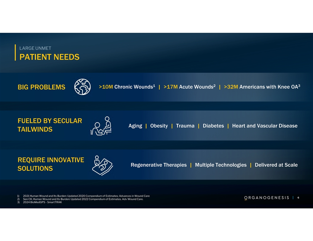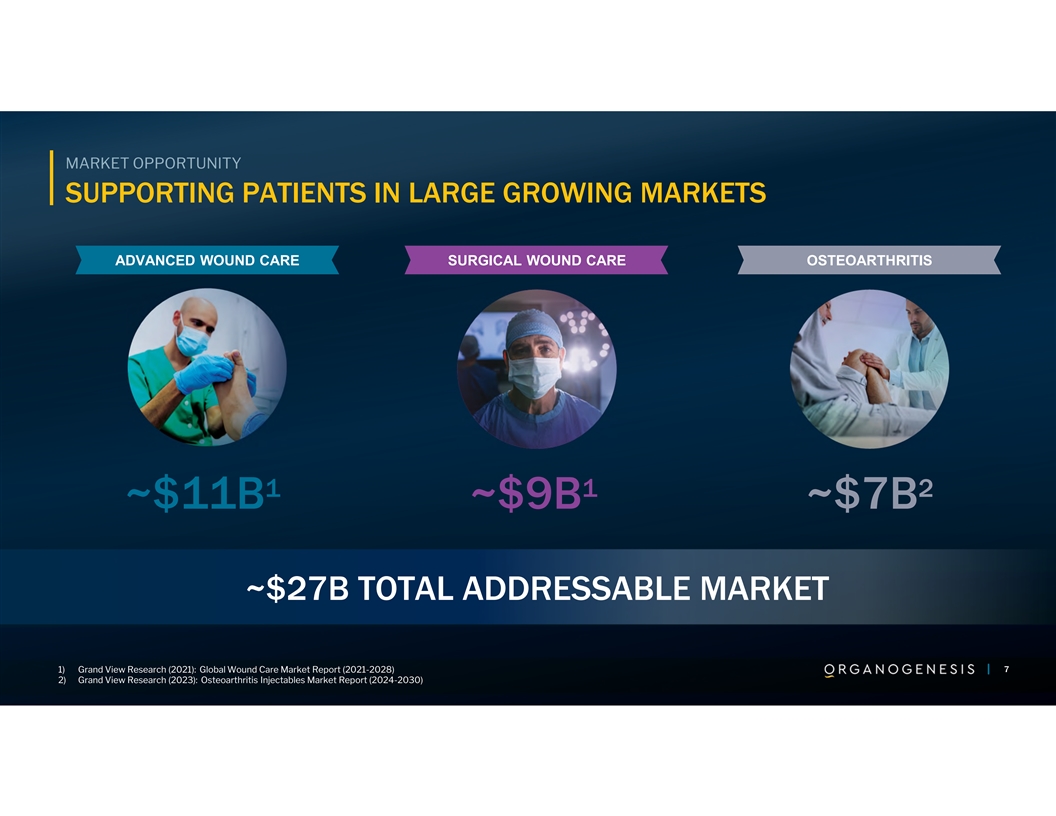 LARGE UNMET PATIENT NEEDS 1 2 3 >10M Chronic Wounds | >17M Acute Wounds | >32M Americans with Knee OA BIG PROBLEMS FUELED BY SECULAR Aging | Obesity | Trauma | Diabetes | Heart and Vascular Disease TAILWINDS REQUIRE INNOVATIVE Regenerative Therapies | Multiple Technologies | Delivered at Scale SOLUTIONS 1) 2021 Human Wound and Its Burden: Updated 2020 Compendium of Estimates; Advances in Wound Care 6 2) Sen CK. Human Wound and Its Burden: Updated 2022 Compendium of Estimates. Adv Wound Care. 6 6 3) 2024 BioMedGPS - SmartTRAK