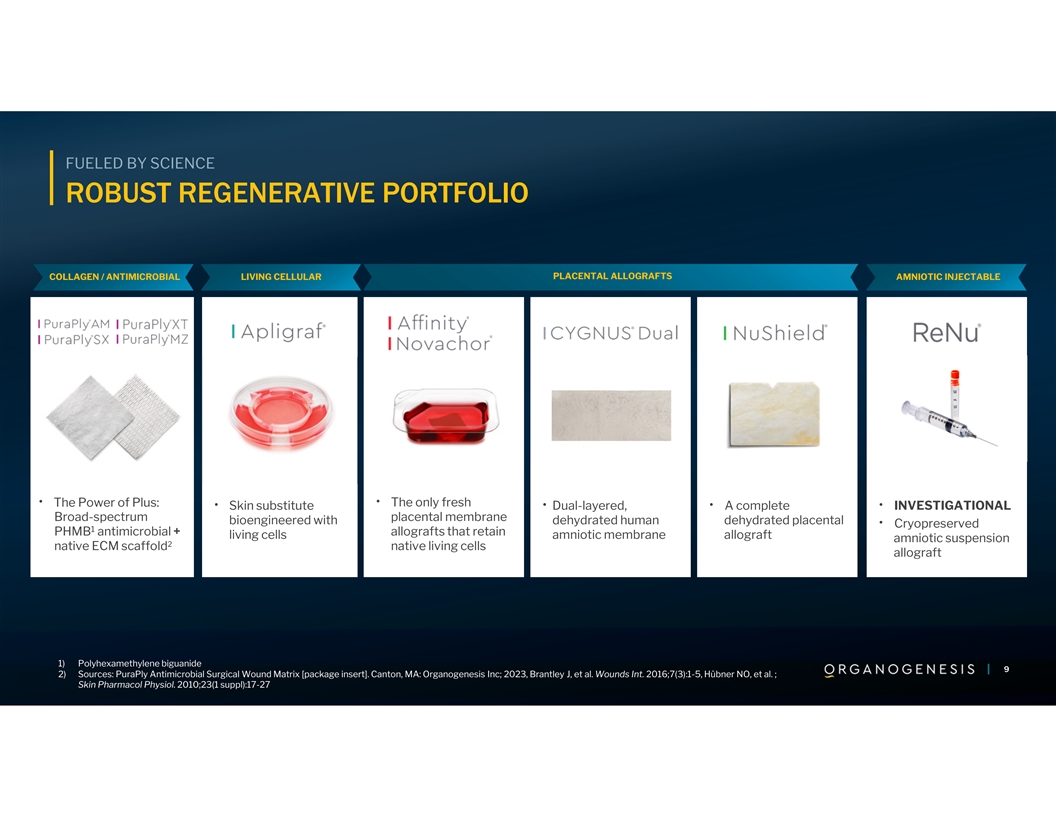 LEADING INNOVATION MULTIPLE TECHNOLOGY PLATFORMS Technology Platform Technology Platform Description Bioengineered Cellular ▪ Products produced from living allogeneic cells ▪ Wound and surgical regenerative therapies ▪ PMA and BLA regulatory pathway ▪ Products derived from human placental tissues and cellular fluids Amniotic / Placental ▪ Processing methodologies for optimal tissue properties ▪ Proprietary processing methodologies (e.g., AlloFresh and LayerLoc) ▪ BLA and 361 HCT/P regulatory pathways ▪ Porcine collagen biomaterial technology platform Collagen Biomaterial ▪ Proprietary tissue cleaning processes ▪ Allows bioengineering of persistence and strength ▪ 510(k) regulatory pathway Antimicrobial ▪ Antimicrobial technology provides clinical and competitive advantage ▪ PHMB is a broad-spectrum antimicrobial that prevents biofilm reformation 1 ▪ PHMB binds and disrupts negatively charged cell membranes 8 8 8 1) Sources: Skin Pharmacology and Physiology 2020:23 (suppl 1): 17-27