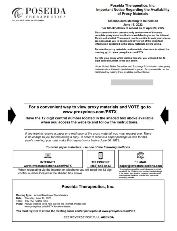 Poseida Therapeutics P.O. BOX 8016, CARY, NC 27512-9903 Poseida Therapeutics, Inc. Important Notice Regarding the Availability of Proxy Materials Stockholders Meeting to be held on June 16, 2022 For Stockholders of record as of April 20, 2022 This communication presents only an overview of the more complete proxy materials that are available to you on the Internet. This is not a ballot. You cannot use this notice to vote your shares. We encourage you to access and review all of the important information contained in the proxy materials before voting. To view the proxy materials, and to obtain directions to attend the meeting, go to: www.proxydocs.com/PSTX To vote your proxy while visiting this site, you will need the 12 digit control number in the box below. Under United States Securities and Exchange Commission rules, proxy materials do not have to be delivered in paper. Proxy materials can be distributed by making them available on the internet. For a convenient way to view proxy materials and VOTE go to www.proxydocs.com/PSTX Have the 12 digit control number located in the shaded box above available when you access the website and follow the instructions. If you want to receive a paper or e-mail copy of the proxy material, you must request one. There is no charge to you for requesting a copy. In order to receive a paper package in time for this year's meeting, you must make this request on or before June 06, 2022. To order paper materials, use one of the following methods. INTERNET www.investorelections.com/PSTX TELEPHONE (866) 648-8133 * E-MAIL paper@investorelections.com When requesting via the Internet or telephone you will need the 12 digit control number located in the shaded box above. * If requesting material by e-mail, please send a blank e-mail with the 12 digit control number (located above) in the subject line. No other requests, instructions OR other inquiries should be included with your e-mail requesting material. Poseida Therapeutics, Inc. Meeting Type: Annual Meeting of Stockholders Date: Thursday, June 16, 2022 Time: 01:00 PM, Pacific Time Place: Annual Meeting to be held live via the Internet. Please visit www.proxydocs.com/PSTX for more details. You must register to attend the meeting online and/or participate at www.proxydocs.com/PSTX SEE REVERSE FOR FULL AGENDA