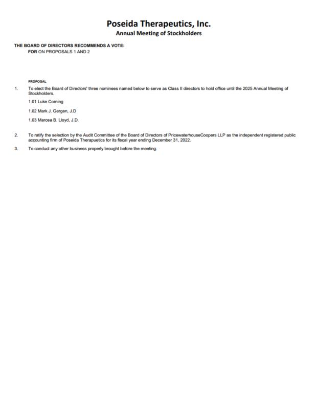 Poseida Therapeutics, Inc. Annual Meeting of Stockholders THE BOARD OF DIRECTORS RECOMMENDS A VOTE: FOR ON PROPOSALS 1 AND 2 PROPOSAL 1. To elect the Board of Directors’ three nominees named below to serve as Class II directors to hold office until the 2025 Annual Meeting of Stockholders. 1.01 Luke Coming 1.02 Mark J. Gergen, J.D 1.03 Marcea B. Lloyd, J.D. 2. To ratify the selection by the Audit Committee of the Board of Directors of PricewaterhouseCoopers LLP as the independent registered public accounting firm of Poseida Therapeutics for its fiscal year ending December 31, 2022. 3. To conduct any other business properly brought before the meeting.