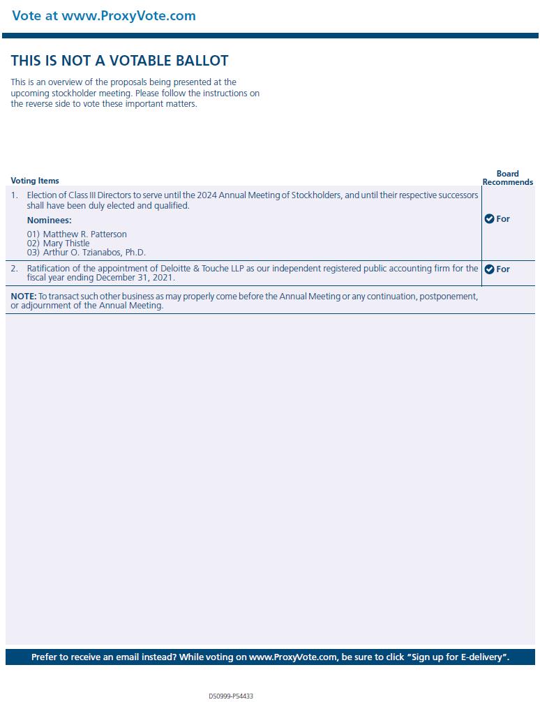 Vote at www.ProxyVote.com Board Recommends Voting Items 1. Election of Class III Directors to serve until the 2024 Annual Meeting of Stockholders, and until their respective successors shall have been duly elected and qualified. Nominees: For 01) Matthew R. Patterson 02) Mary Thistle 03) Arthur O. Tzianabos, Ph.D. 2. Ratification of the appointment of Deloitte & Touche LLP as our independent registered public accounting firm for the fiscal year ending December 31, 2021. For NOTE: To transact such other business as may properly come before the Annual Meeting or any continuation, postponement, or adjournment of the Annual Meeting. Prefer to receive an email instead? While voting on www.ProxyVote.com, be sure to click “Sign up for E-delivery”. D50999-P54433 THIS IS NOT A VOTABLE BALLOT This is an overview of the proposals being presented at the upcoming stockholder meeting. Please follow the instructions on the reverse side to vote these important matters.
