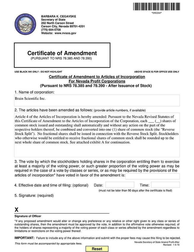 The proposed form of amendment to our Articles of Incorporation, as amended, to effect the Reverse Stock Split is attached as Appendix A to this Information Statement. Any amendment to our Articles of Incorporation, as amended, to effect the Reverse Stock Split will include the Reverse Stock Split Ratio fixed by our Board, within the range approved by our stockholders.