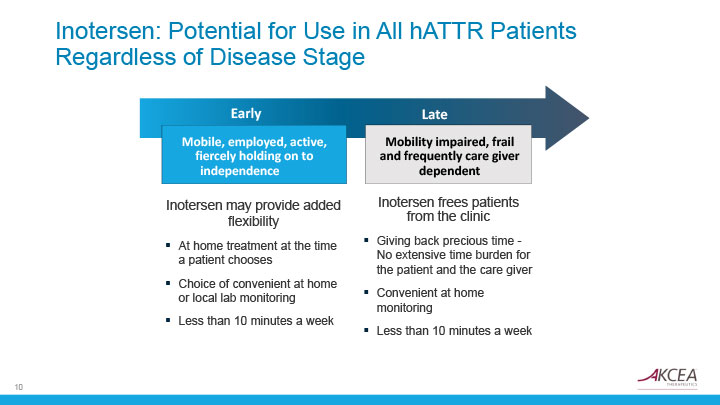 Inotersen is a drug that can truly impact both the early stages and later stages of the disease, in the way that we believe that it will provide patients significant advantages, is that even the early stages of the disease, where these patients are still trying to hold onto their independence. They're still working, it is a drug that offers at home convenient dosing that they can do themselves then in the later stages, where they’re mobility impaired and caregiver dependent they can still take their drugs at home and not be dependent on a caregiver to bring them up for their treatment.