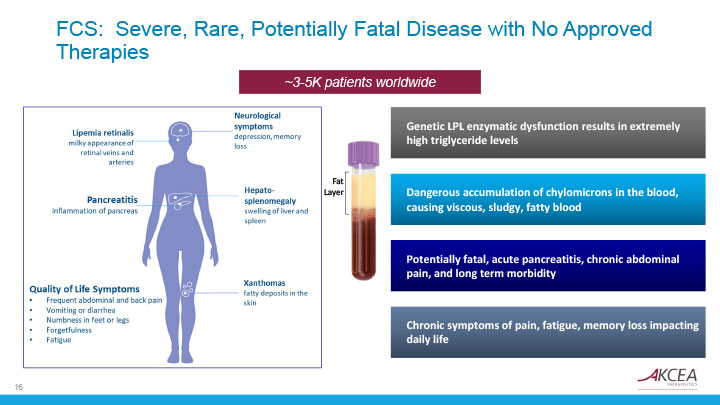 These patients also suffered daily symptoms from their disease that affects them causing things like nausea, vomiting, brain fog, fatigue, they have difficulty working. So it's not only disease that results in a very acute life-threatening event, but is also affects their daily living. They can't eat any dietary fat otherwise it could send them into the ICU. There are no treatments for this disease today.