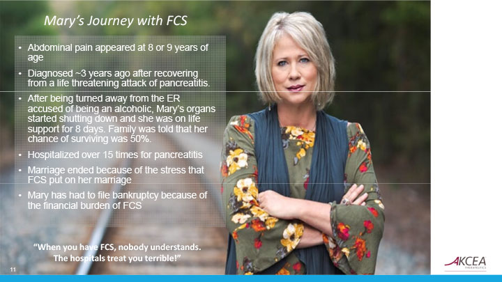 Mary is someone who, although she lived with abdominal pain all her life, didn't know that she had this disease. She had a pancreatic attack later in life and was in – her organs started to shut down. Excuse me. And she was on life support. She then had 15 more bouts of pancreatitis. It affected her marriage, she filed bankruptcy, it truly is a disease that affects these patients, their lives and their ability to live a normal life, in addition to having that looming threat of acute pancreatitis that could kill them.