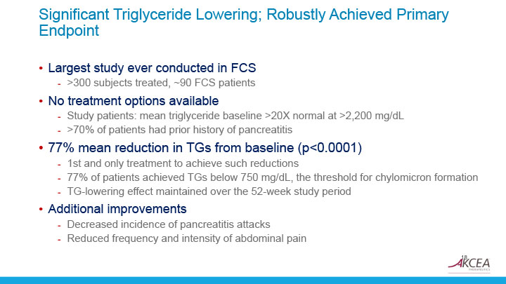 So in our Phase 3 study for volanesorsen we had robust efficacy in our primary endpoint we showed 77% reduction in triglycerides. This is something that has never been achieved for these patients. All of these patients – they do not respond to any triglyceride lowering treatment because of the defect in their enzymatic pathway is how current treatments work. So this is quite profound for these patients. We also saw improvement in decrease incidence of pancreatitis attacks and pain intensity. So important efficacy in these patients we are very well on track in terms of our regulatory interactions as I mentioned. An important point that we do have AdCom, FDA panel on May 10. We have only one risk that we are managing and that’s platelets fact with these patients. These patients and FCS inherently have volatile platelets levels high and low. Volanesorsen does add to that, but this is something that's very monitorable and manageable. And we are able to manage these patients through that support program that we've been using throughout our open label extension. We have a high touch patient support case management group that we've already built out in anticipation for commercial launch and that program really is designed to accommodate any potential realm.