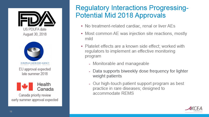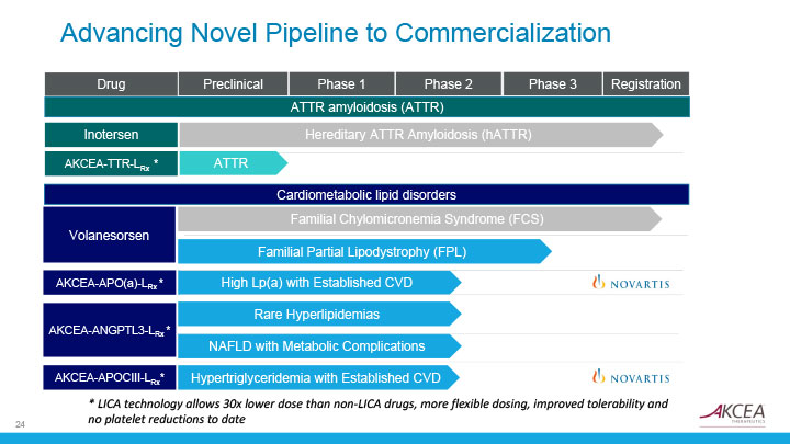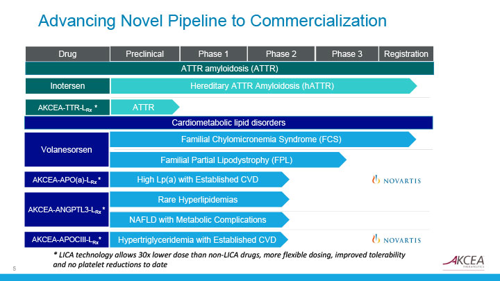 Both drugs have been filed U.S., Europe, and volanesorsen also in Canada and with the addition of these two additional drugs we now have six drugs in our pipeline. I’ll just talk a little bit about the collaboration first, since it has just occurred. It's an important one for us, because at Akcea our focus has been to develop and commercialize novel therapies. This accelerates our ability to become a very significant player especially in rare diseases.