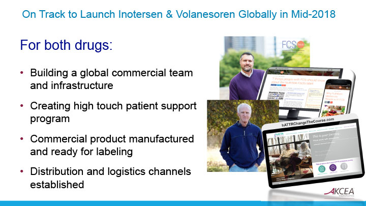 So importantly, inotersen has the opportunity to provide a very effective and convenient treatment for this very devastating disease. We have filed in U.S. and Europe, the PDUFA date is July 7 for inotersen. The FDA has indicated no AdCom panel will be necessary. So we're very much in the mode of gearing up for a very rapid launch for inotersen. We also have an expanded access program that has been open that we've seen tremendous drive for and so we're opening up more sites than we had originally anticipated.