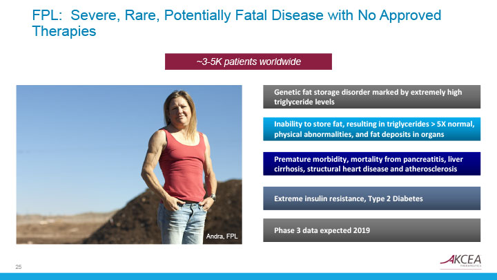 So I talked about our two near-term, commercial launches inotersen and volanesorsen, we also have other drugs in our pipeline. First, with volanesorsen, we do have a second rare disease familial partial lipodystrophy that we’re in Phase 3 clinical development for, data readout is expected next year. This is another disease with no approved therapies, different from FCS these patients lack the ability to store fat, they have defective adipose tissue, the essential of no adipose tissue throughout their bodies, you can see a typical patient just around her chin and face but what looks to be muscular appearance is actually fat deposited at topically in the muscle.