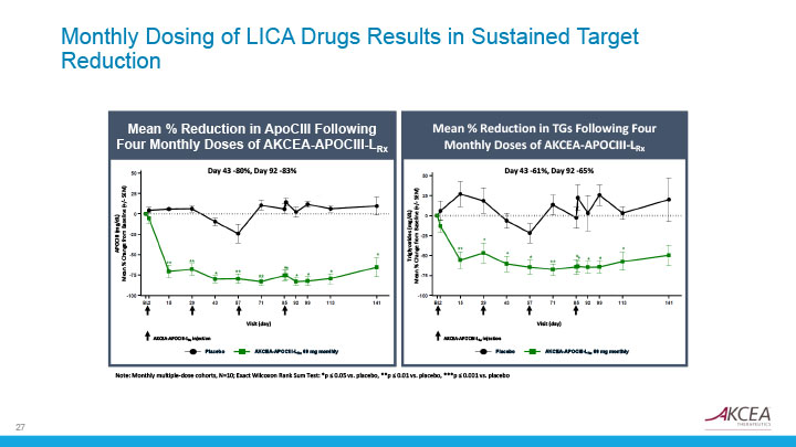 And just to give you a sense, not to go through all, each of these drugs but to show you some monthly data on the APOCIII LICA we've seen consistency across all of the LICA. So on this data we reported out shows a period of four monthly doses at 60 milligrams monthly giving us equivalent knockdown of what we see on a weekly basis, very good tolerability, no platelet effect, so very confident that this will readout across all of the LICA drugs in our platform to have that consistent knockdown and a good safety profile.