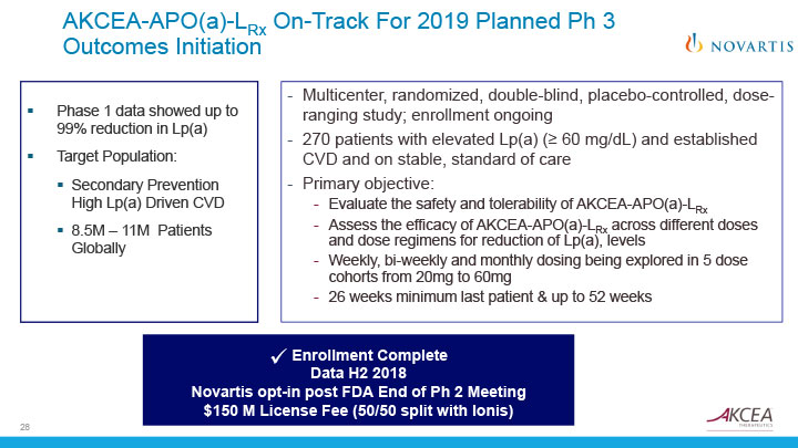 Novartis is working hand-in-hand with us to design a Phase 3 trial, which they would then run; it would be a large outcome study. We anticipate going to the FDA later this year with an end of Phase 2 meeting. And Novartis would then have an opt-in period to opt in with a $150 million license fee which we expect in the early part of next year and that would be split 50-50 with Ionis.