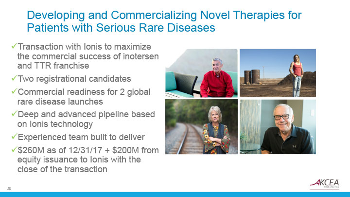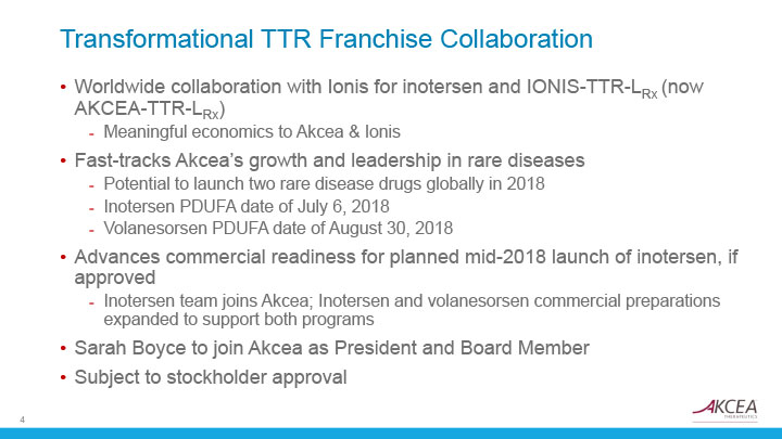 Ionis has begun to build out their commercial infrastructure, and so with this transaction, we're bringing over their leadership from that team. Sarah Boyce who had been leading the build-out of the inotersen team will be coming over to Akcea as President in joining our board, and this transaction will be subject to shareholder approval which will be in April, the middle of April, it will be a shareholder vote meeting.